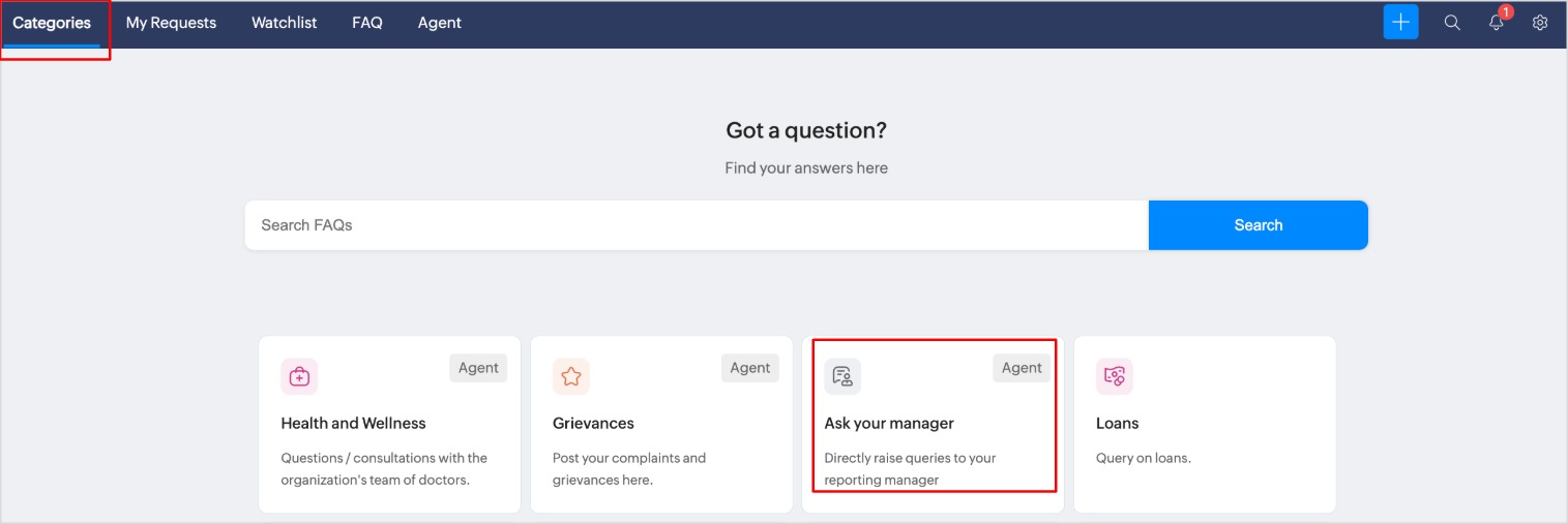 Use the 'Ask Your Manager' category to submit a query to your reporting manager. This option is available only if the administrator has enabled this category in the settings.