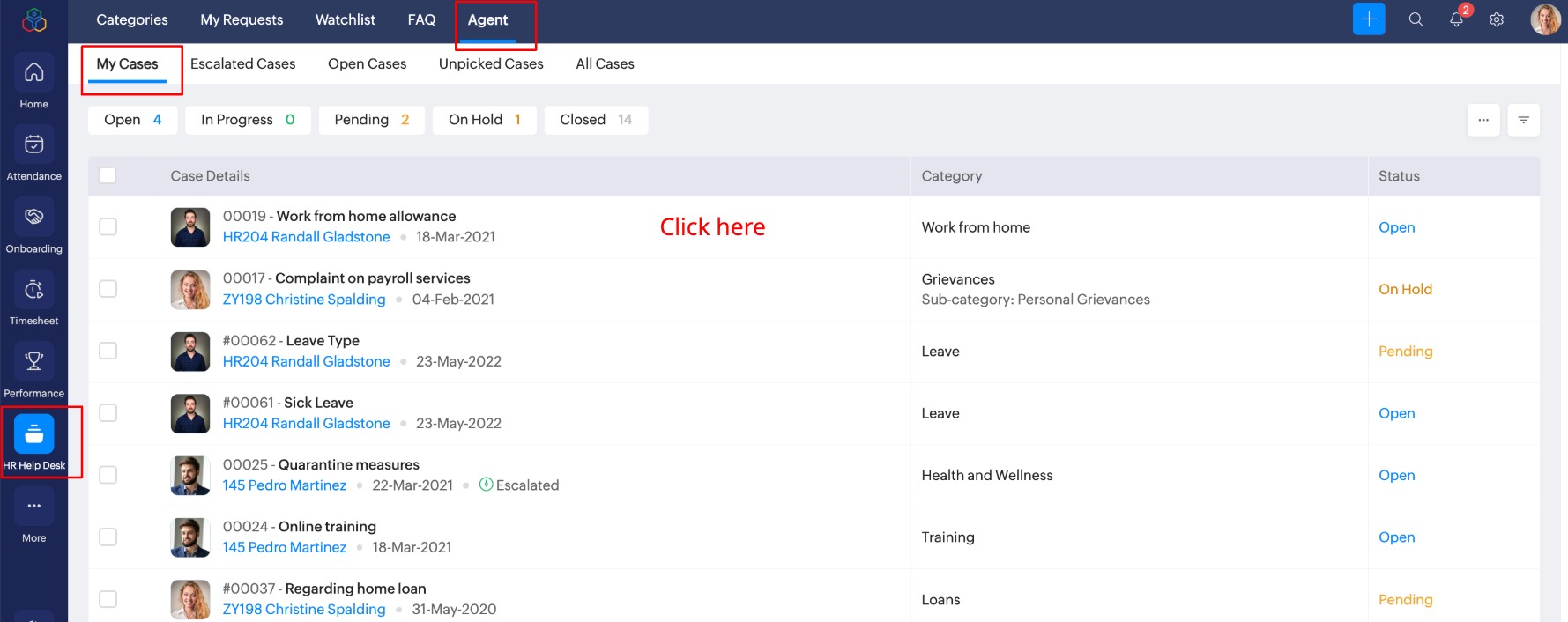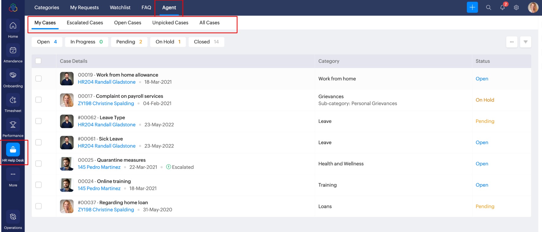 Agents tab in HR Help Desk service is an administrators and agents space where they can manage and resolve the case requests raised by the employees in the organization. The following sections detail the views and actions that can be performed on the agent tab.