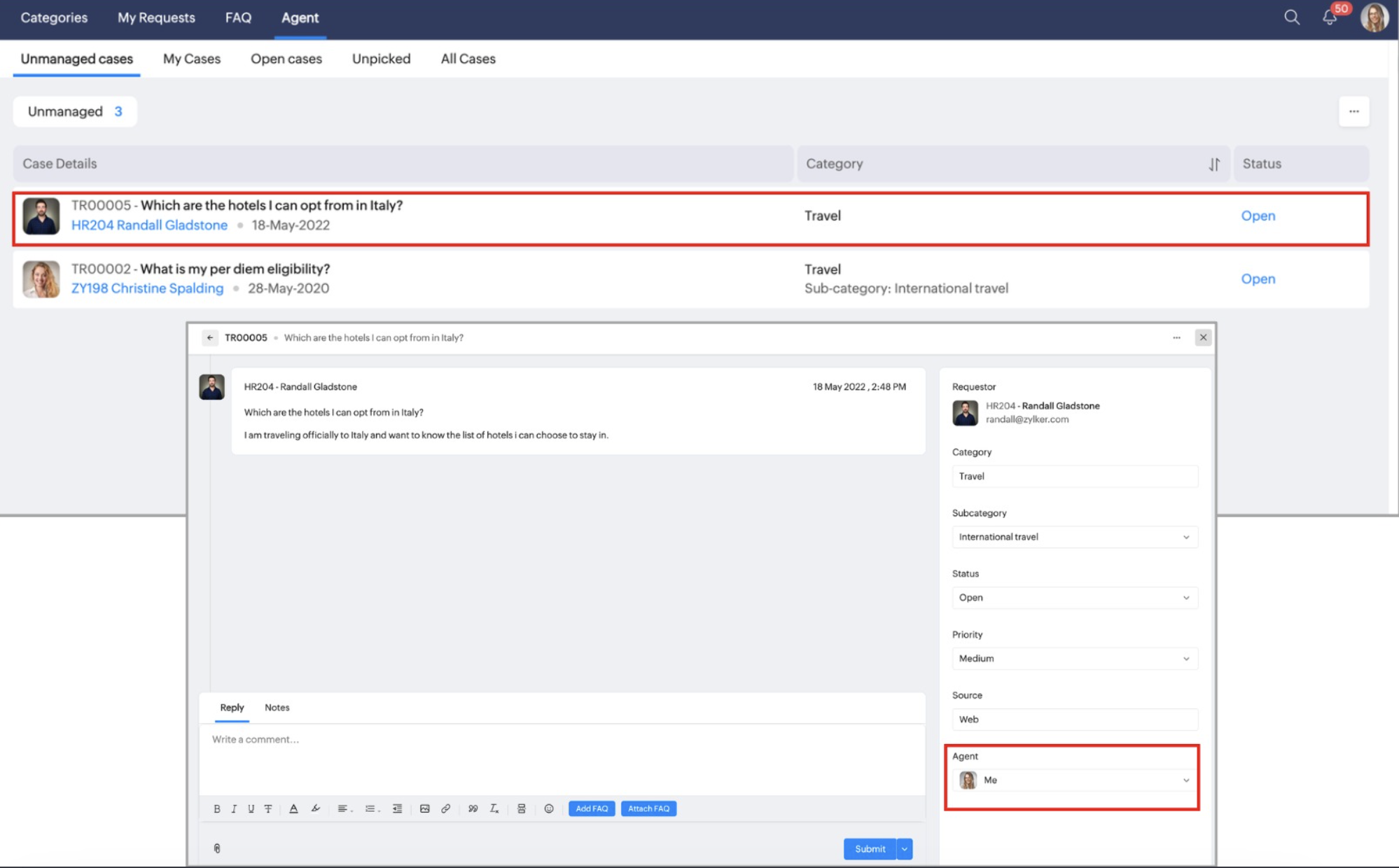 2. An individual user/group/department under the category picks up the case and works on it as 'Agents'.