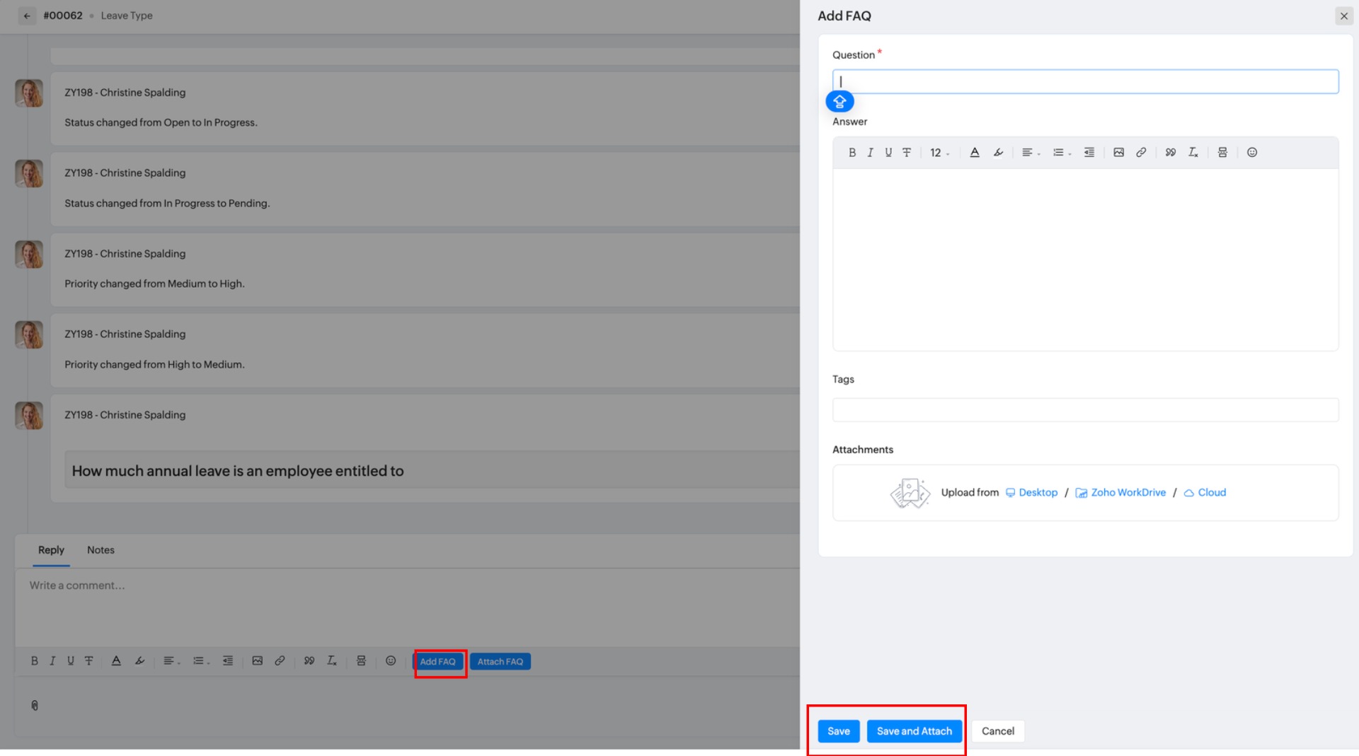 8. Click Save and Attach: This option adds the FAQ to the FAQ section of the Case Category and attaches it to this case request.