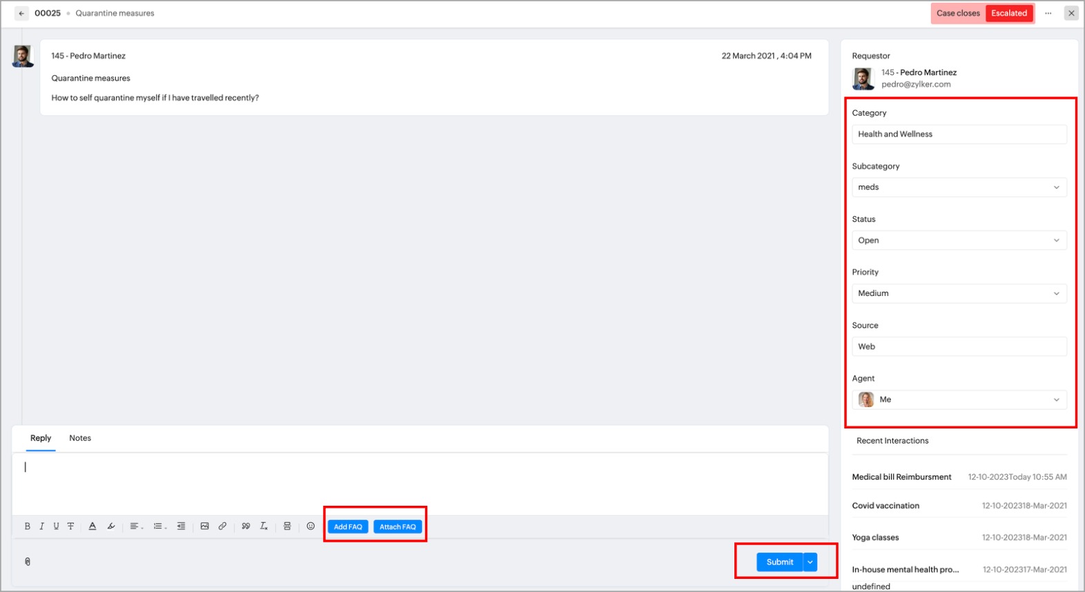 When responding to a question, the Agent or the Admin can use existing FAQs, or create new ones to supplement their response.