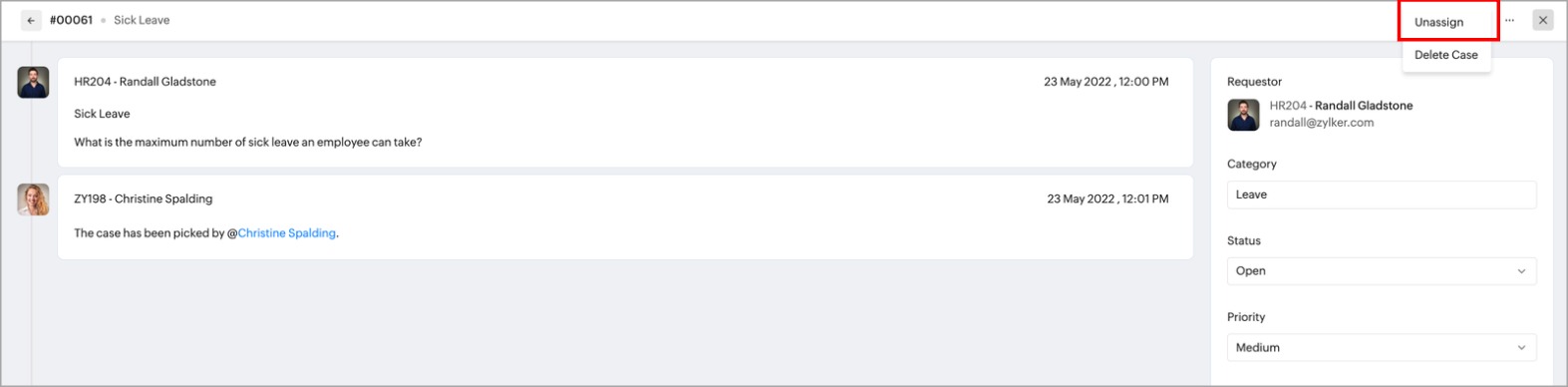 If you (Agents or Admins) are mistakenly assigned to a case or need to leave for whatever reason, you can unassign yourself from it.