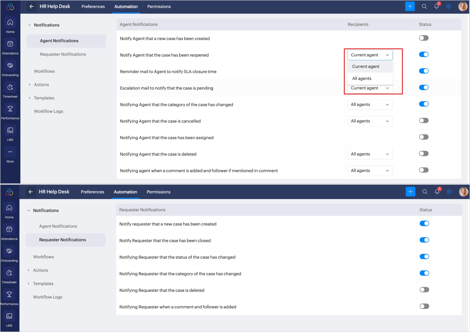 2. Select Agent or Requester notification which you would like to enable or disable.