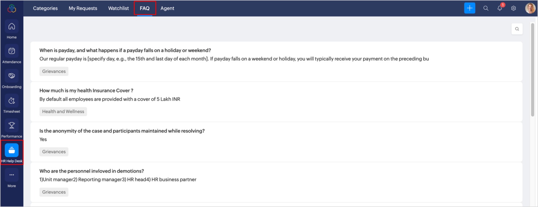 1. Employee can search and find FAQs related to their query in HR Help Desk > FAQ