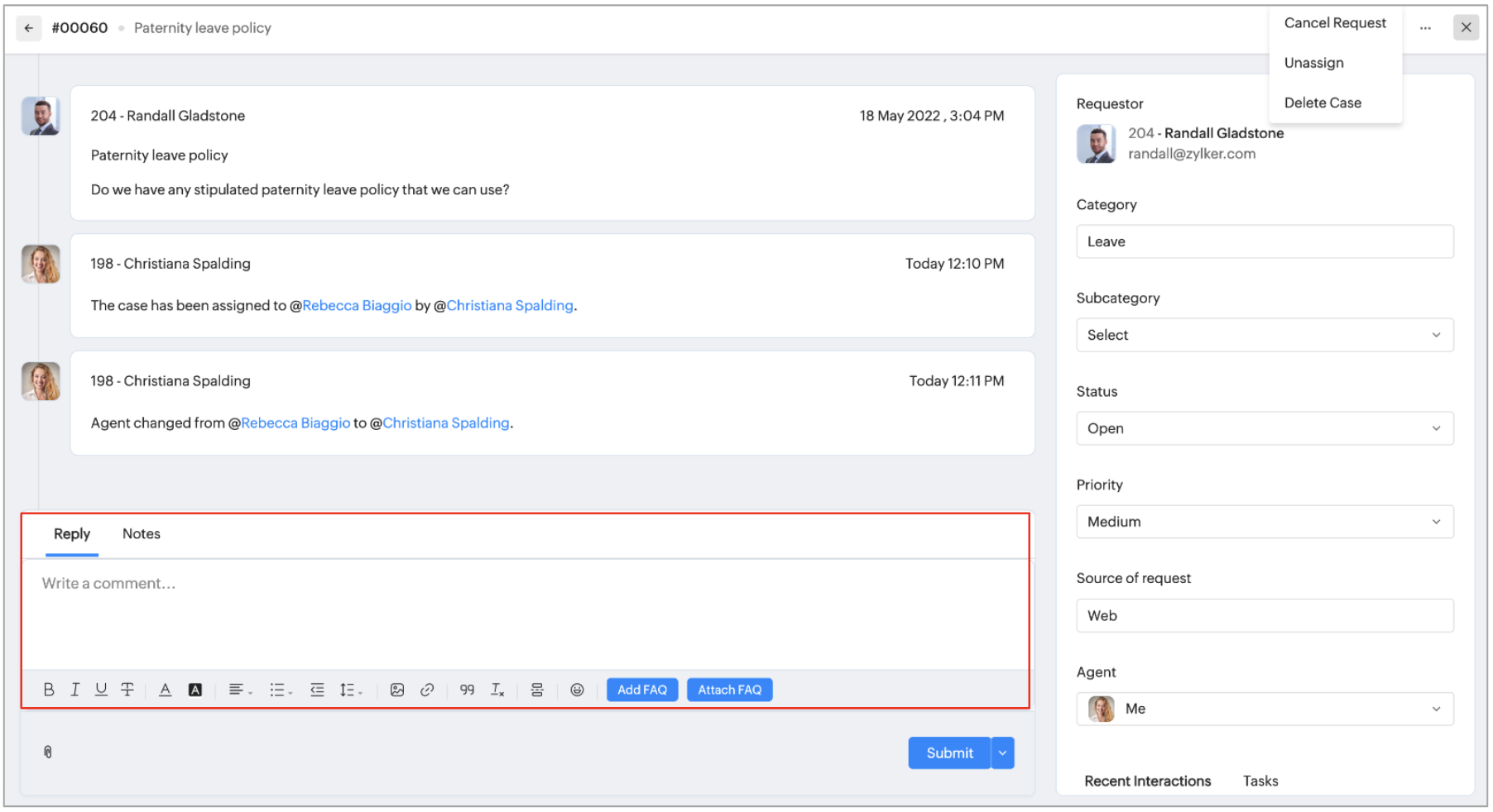 2. The right side section allows you to change case status, set priority, and change agent.