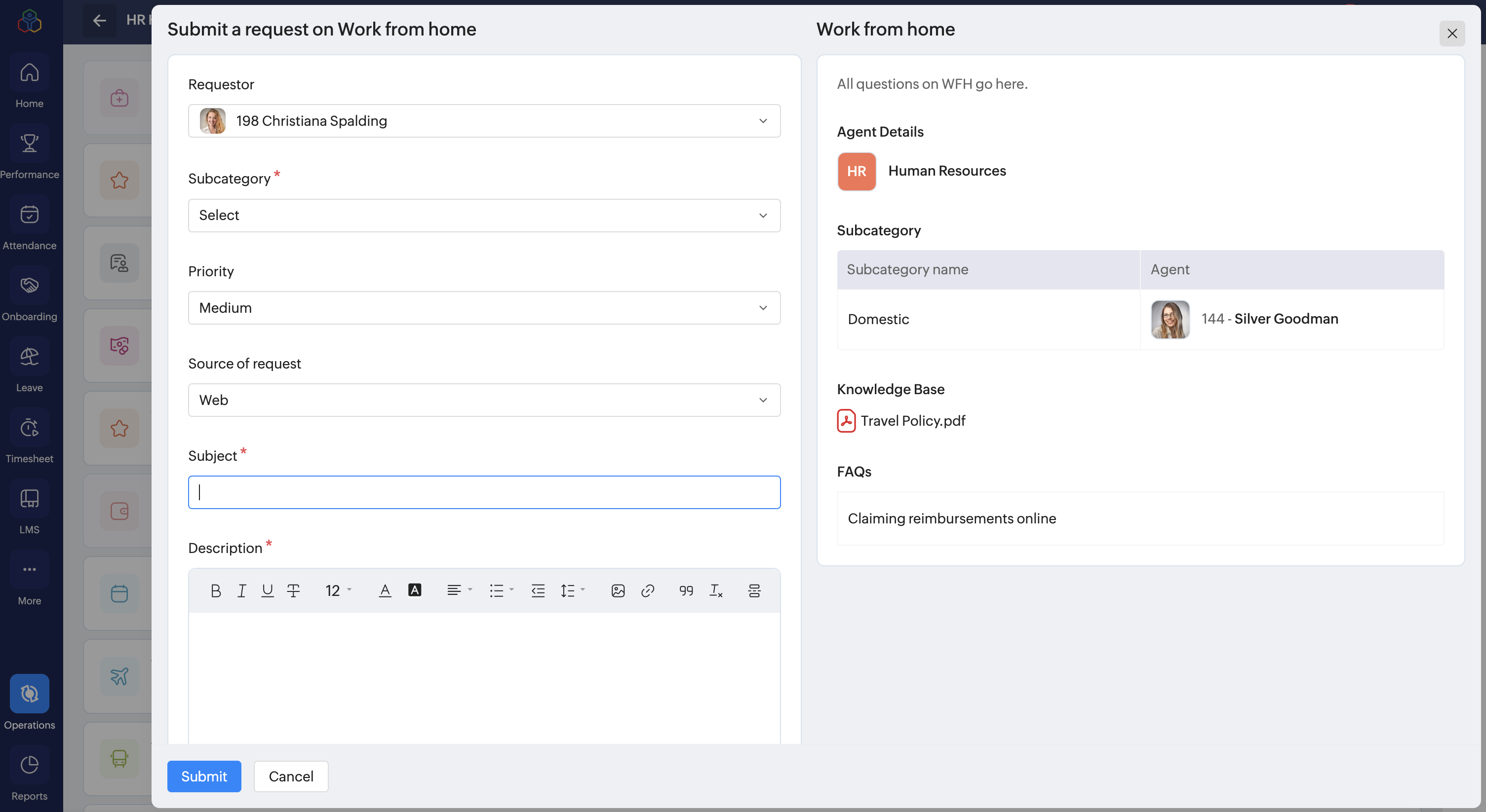 9. Click Submit. Your request will be submitted and assigned to the respective agent.