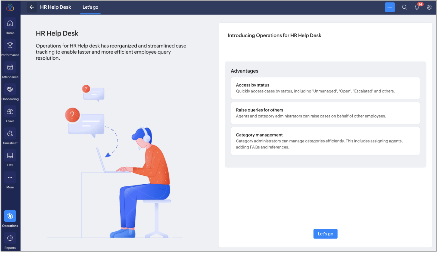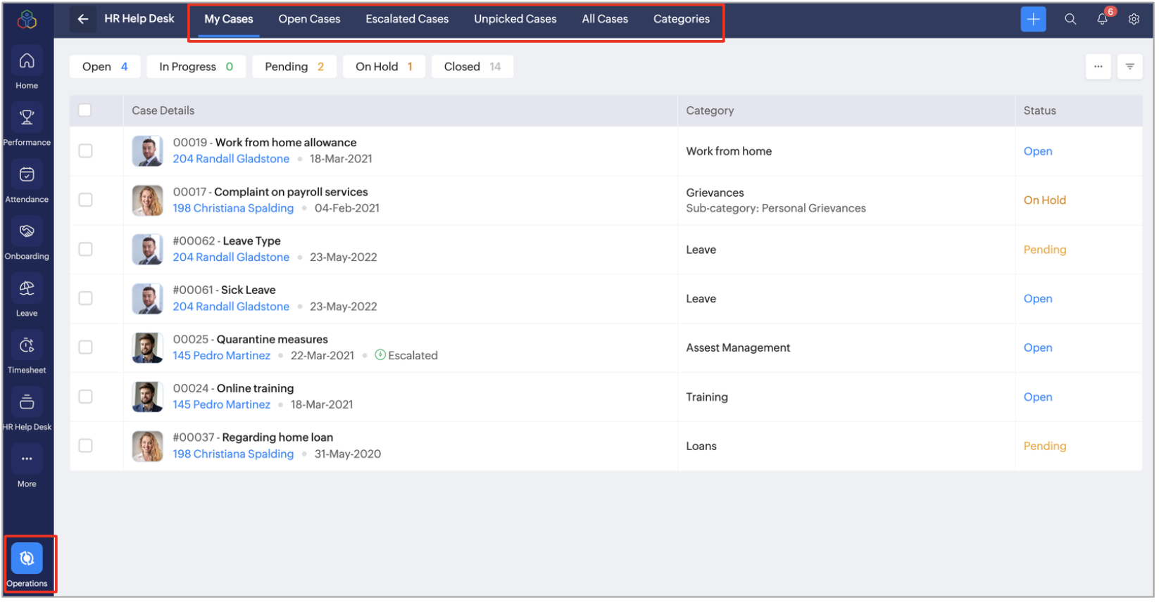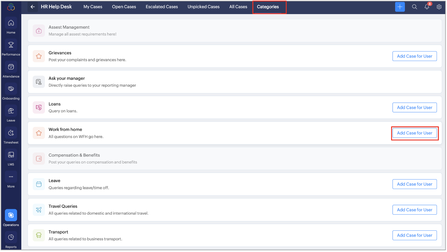 HR Help Desk in operations is where admins and agents handle employee case requests. It lets them view, assign, and resolve cases from one place. You can also add a case for another user under the categories tab.