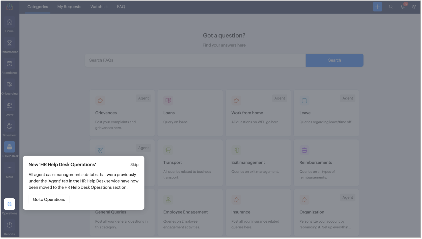 Here’s how the HR Help Desk will appear when you first access the Operations tab. It displays the default landing page that highlights its key features and actions you can perform from this space.