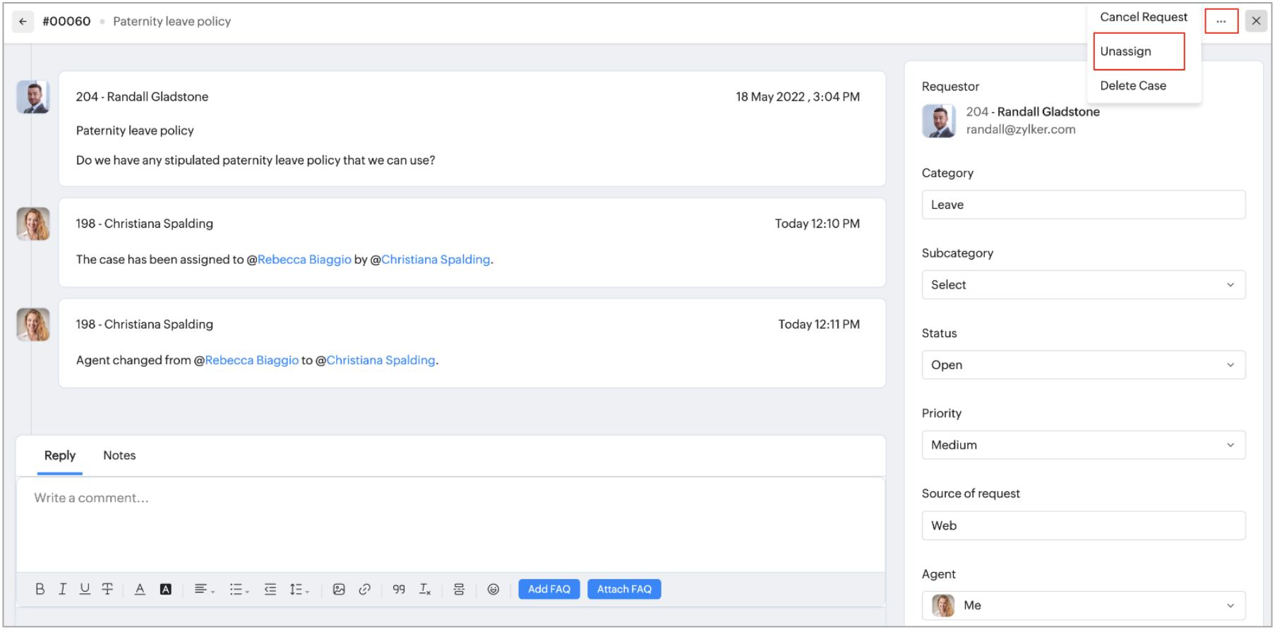 4. Select Unassign. The agent will no longer be associated with the case.