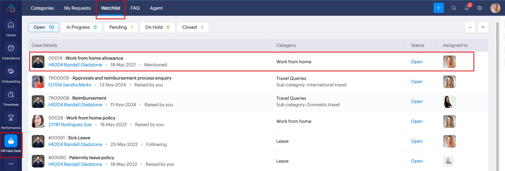 The Watchlist tab allows all your employees to see the cases in which they are involved. All cases in which an employee has been @mentioned will be shown in this tab.