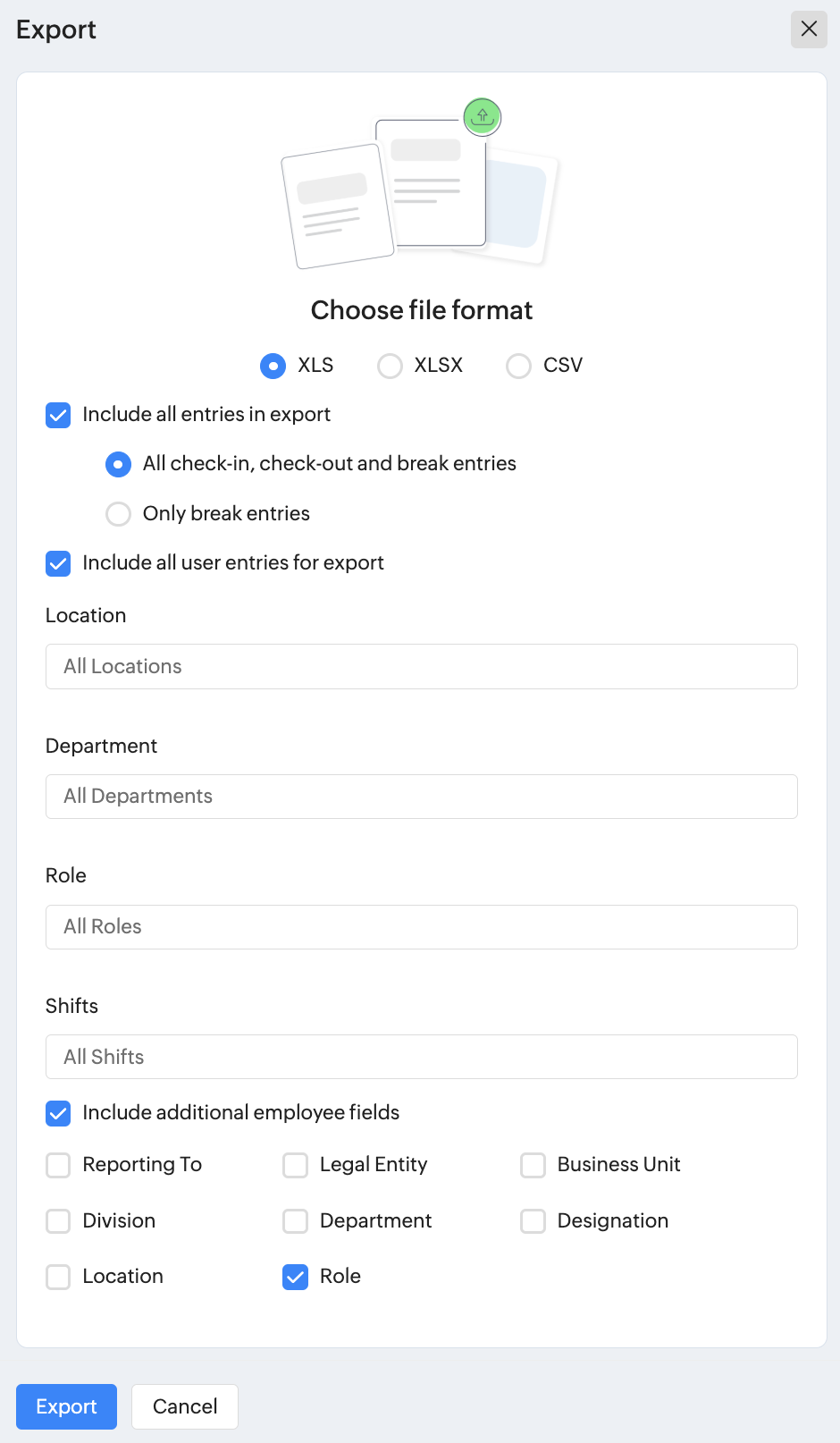 Enable Include additional employee fields checkbox if you want to include additional employee fields from the employee form (even ones not included in a particular report) such as Department, Location, etc.