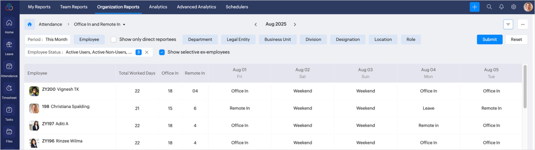 This report summarizes whether employees marked their attendance from Office (from the workplace) or Remote (checked in via web or mobile from home or elsewhere). It helps organizations track work modes, monitor on-site presence, and manage hybrid work arrangements effectively.