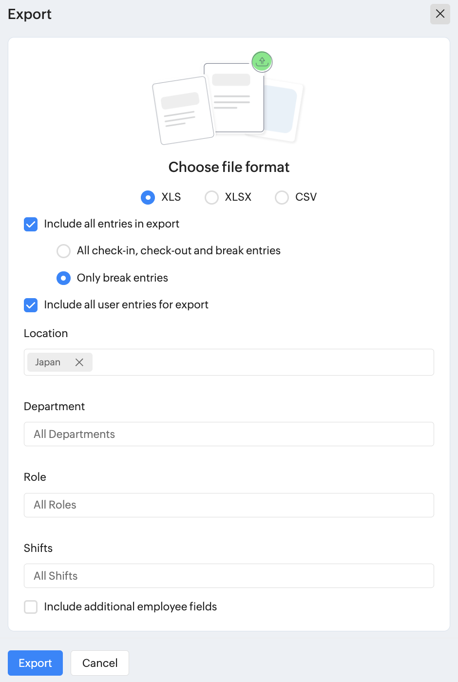 "All check-in, check-out and break entries" option if you need complete data along with breaks) and click Export.