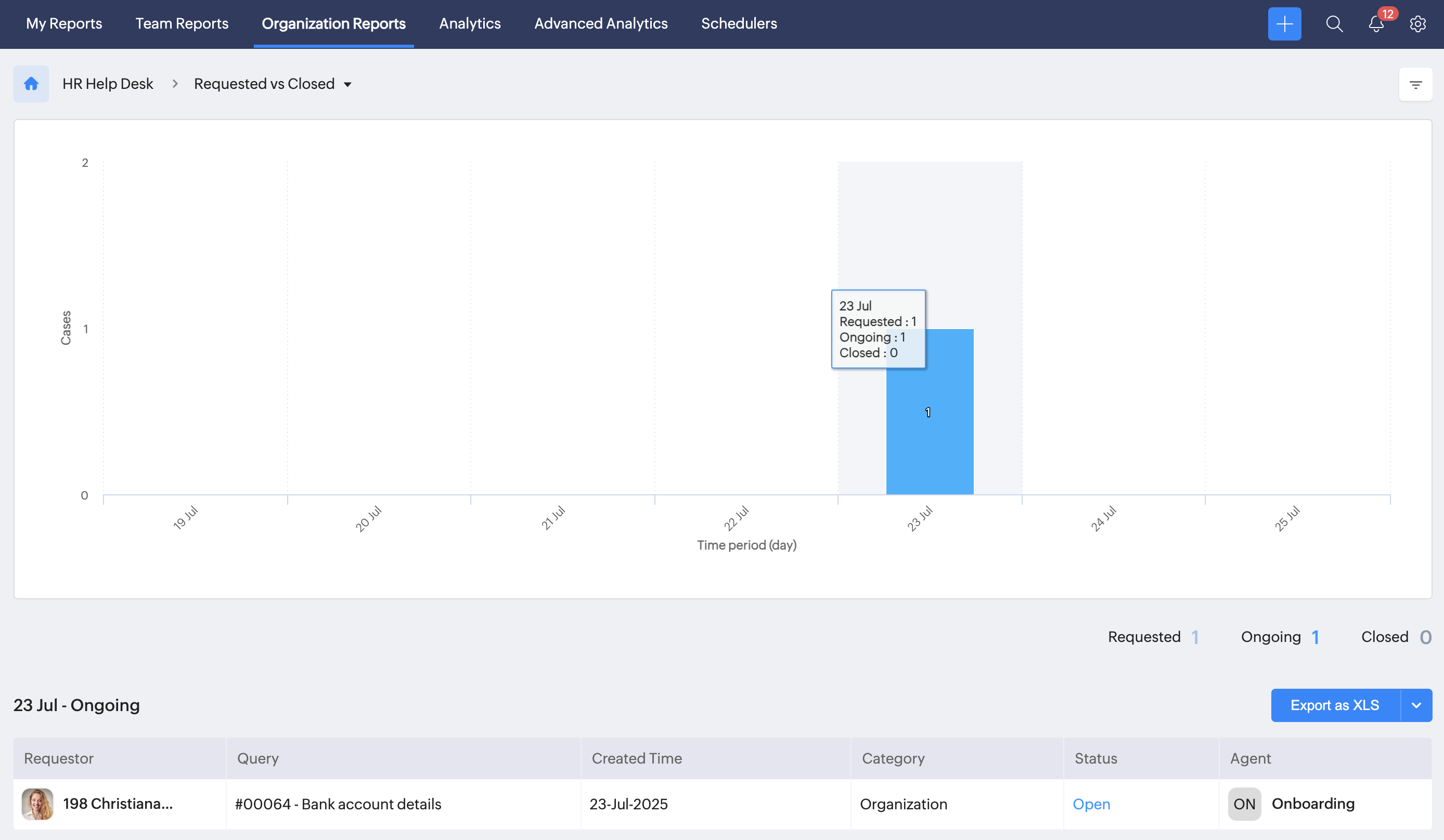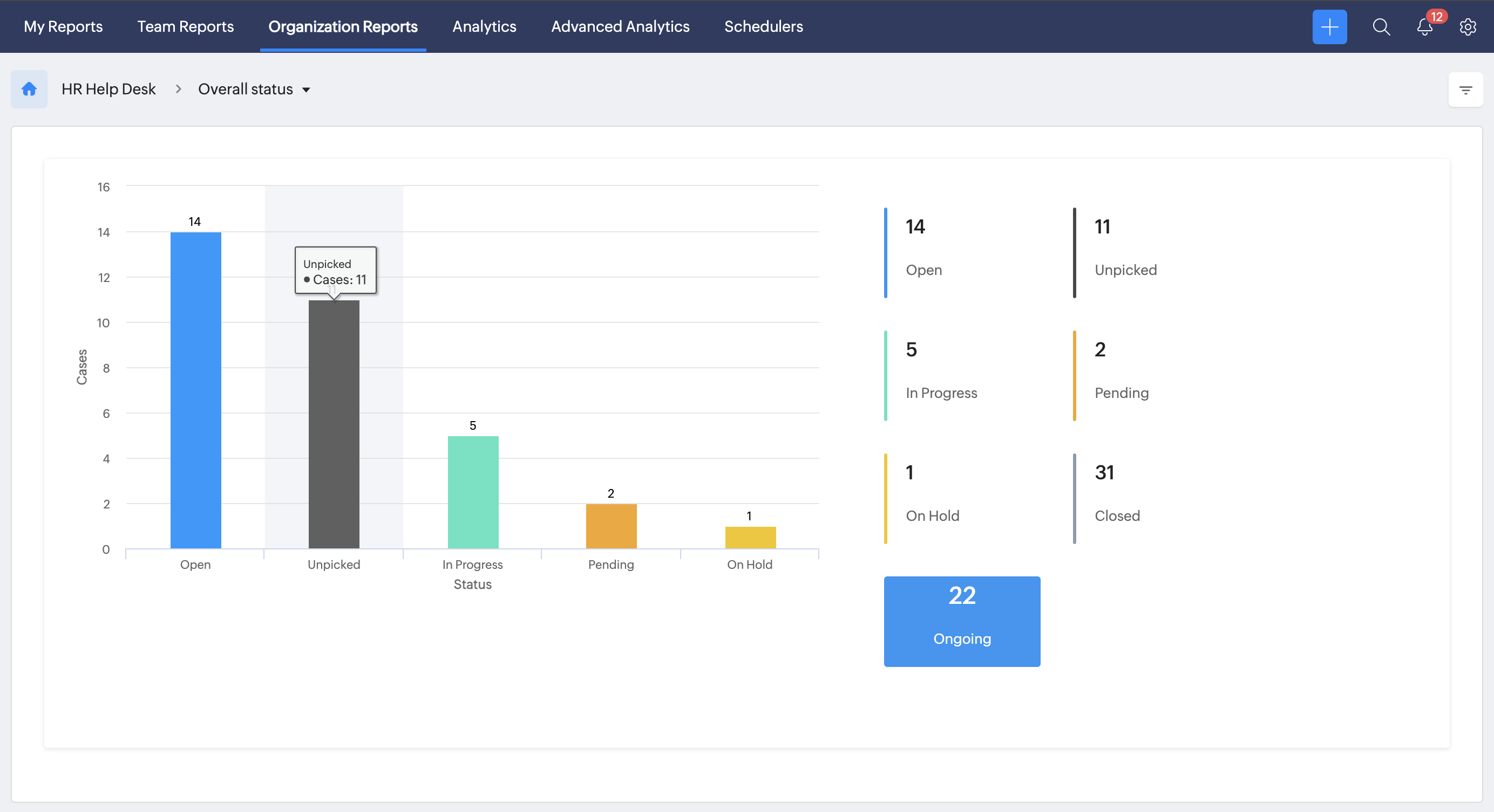To access various case reports, navigate to Reports on the bottom left corner of your screen and go to the Organization Reports tab. You can use the filter feature available on the top right, corner (filter icon) to search based on time, category, and more.