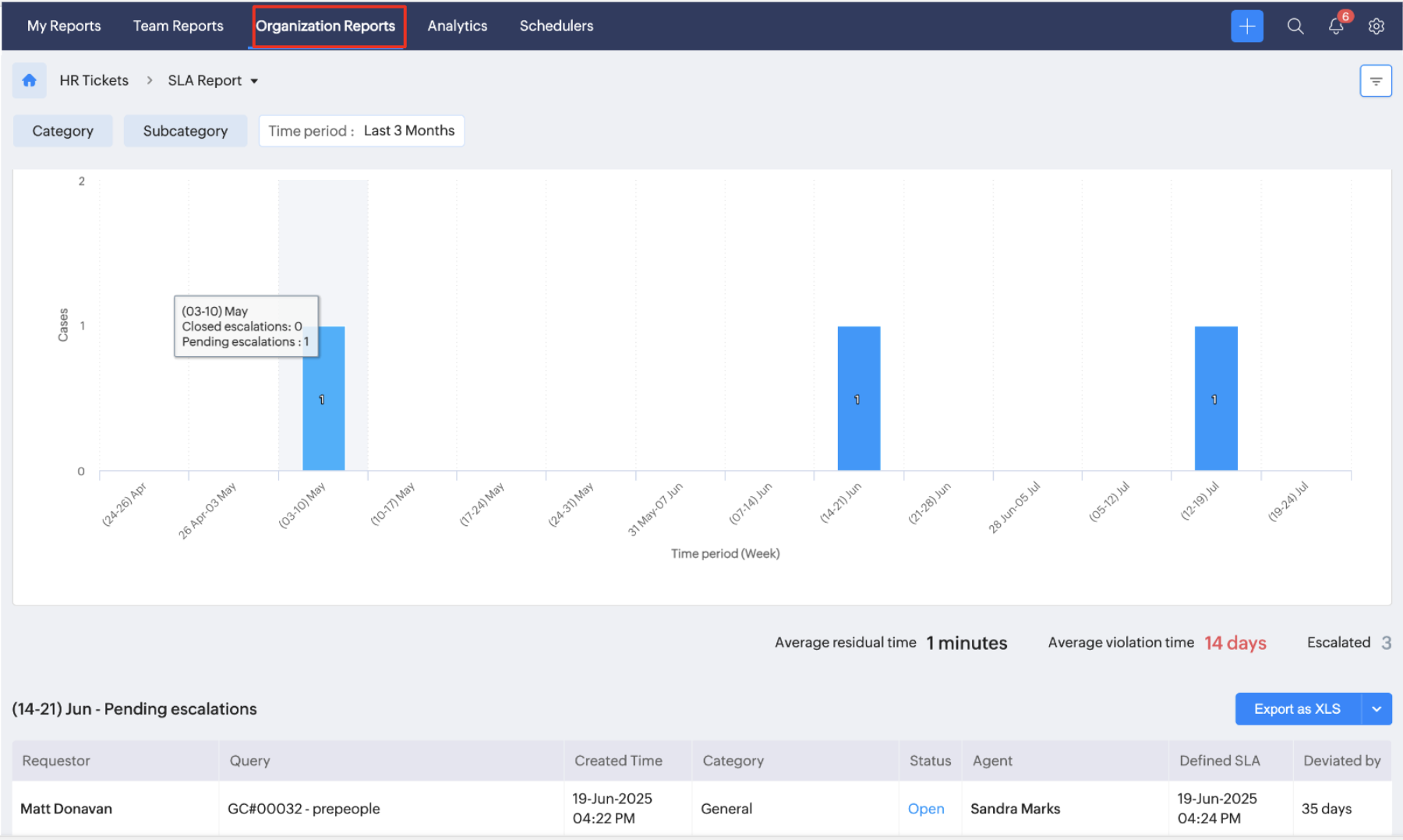 This report shows if cases followed SLA timelines or missed them. You can filter the data by hours, days, or weeks to track performance.