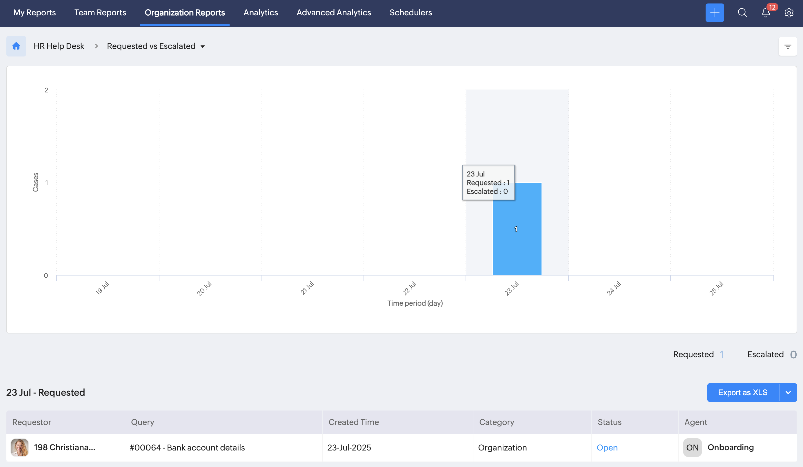 When a case is not completed within the set time as per the SLA, it becomes an escalated case. This report shows the number of cases in escalation and the number of requested cases.
