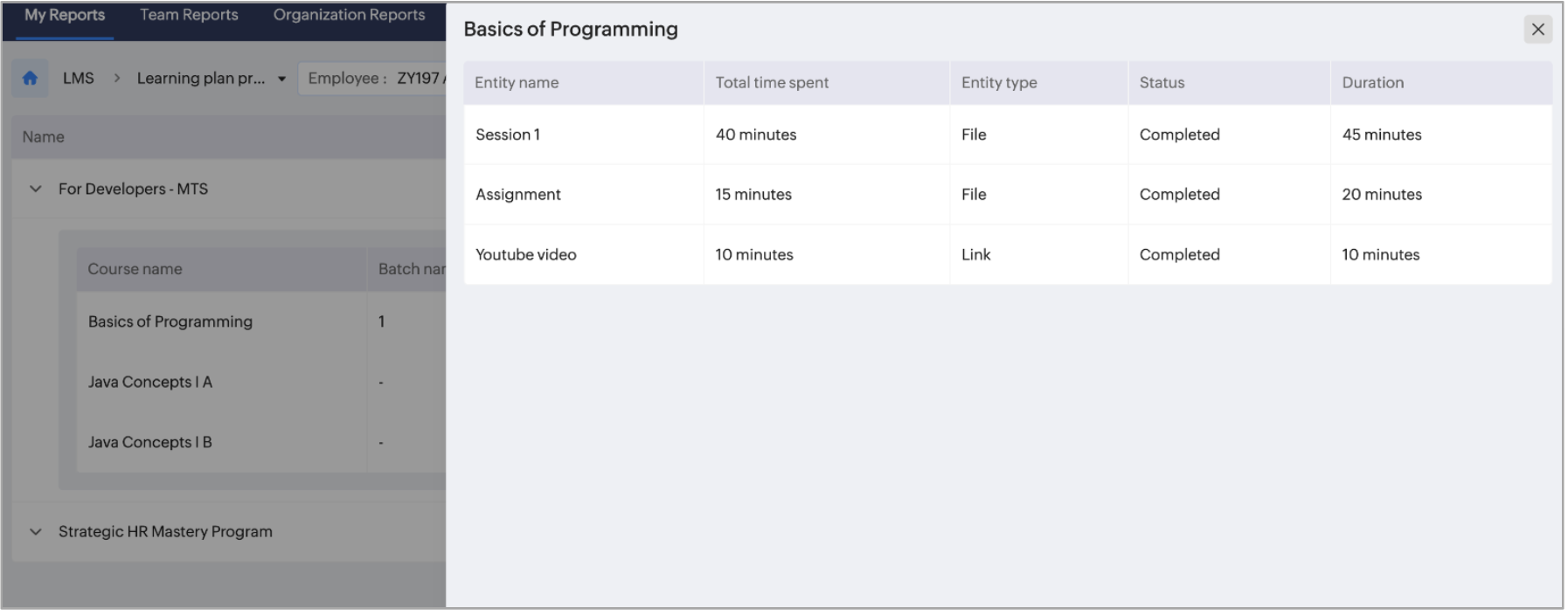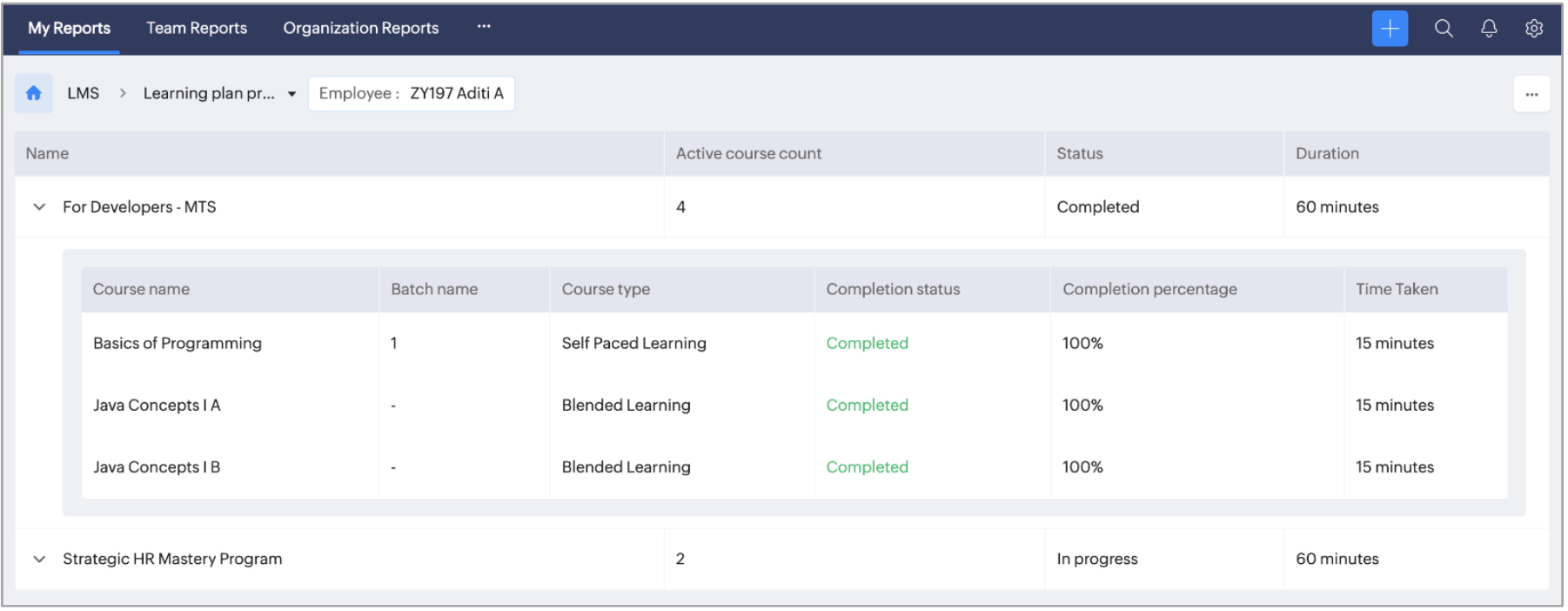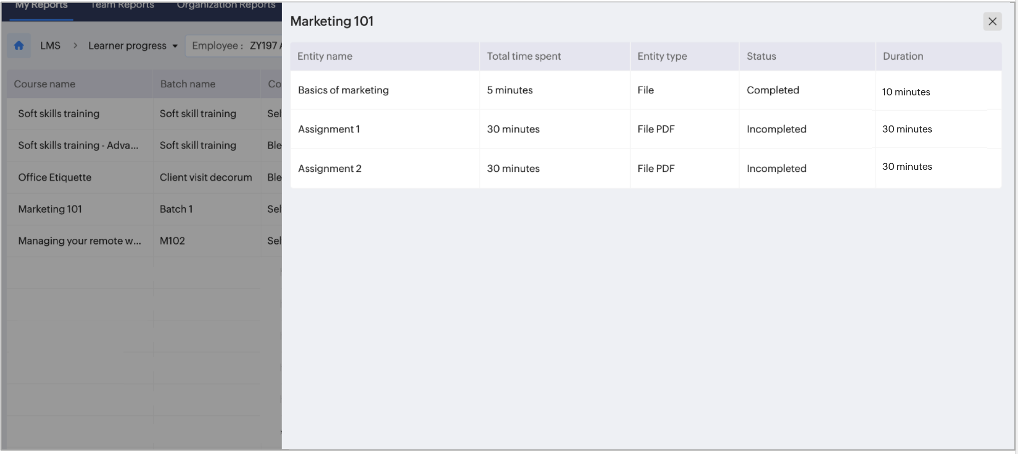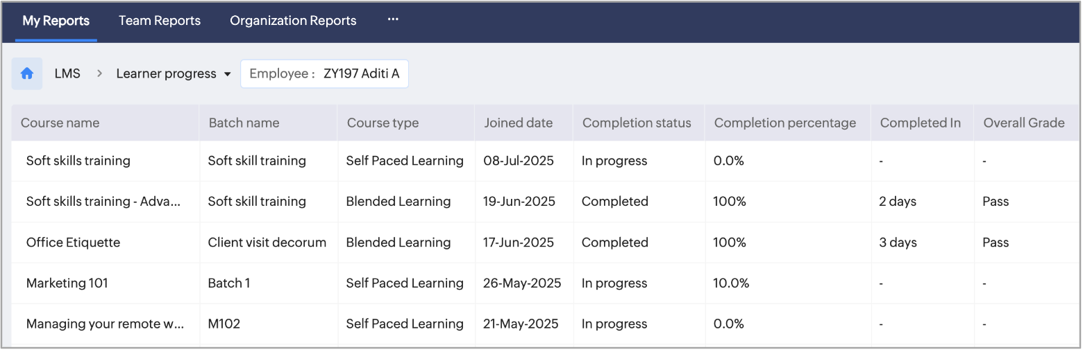 The learner progress report displays the complete list and details of courses taken by each employee, including their completion status and the time they have taken to complete them. Use the drop-down to select the employee's name whose progress you want to see.