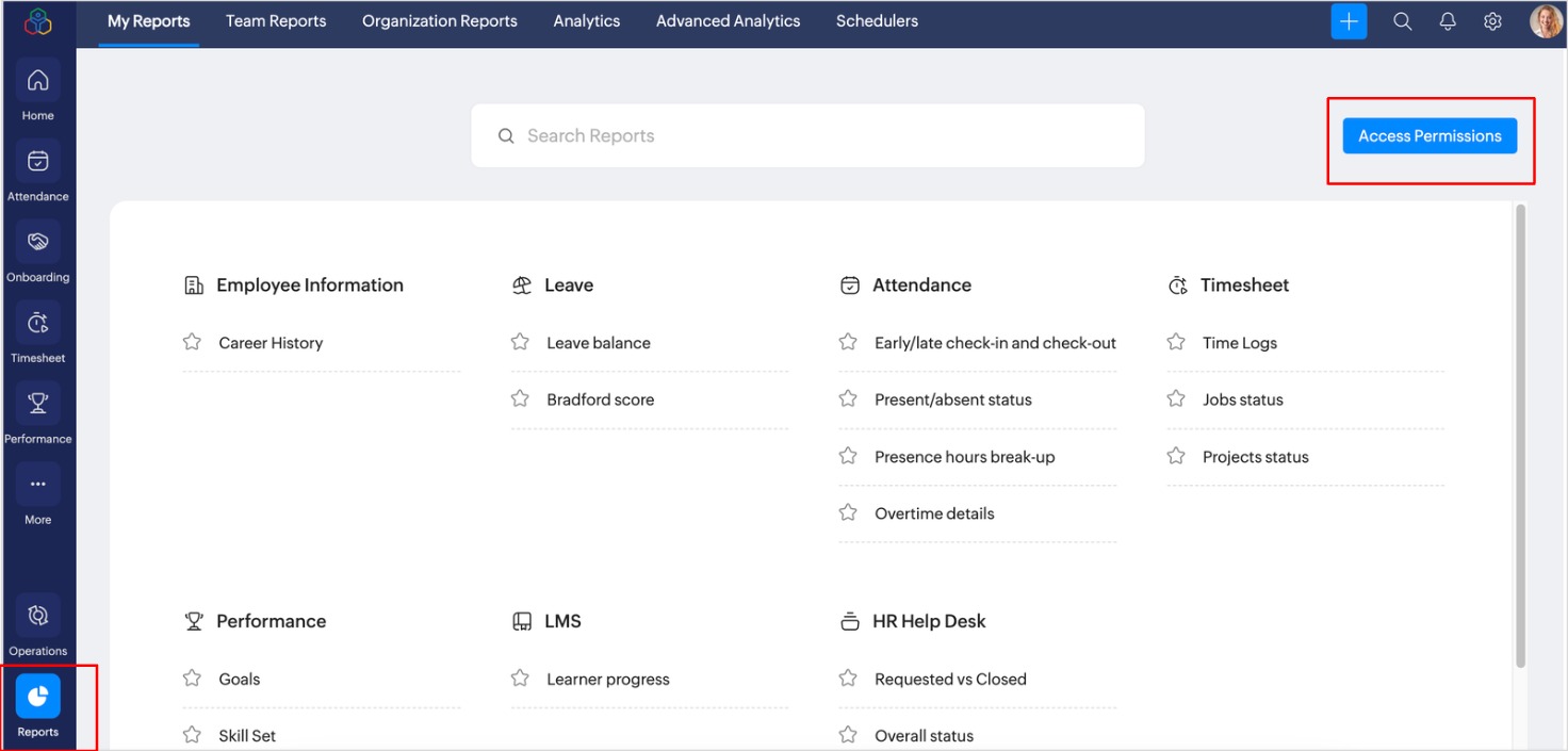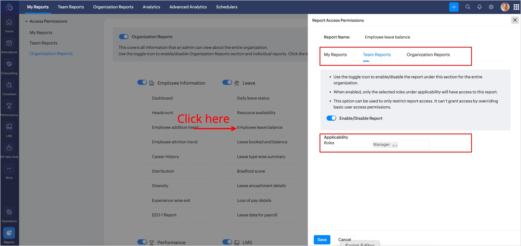 Using the Access Permissions button, administrators can enable or disable selective reports and also grant or deny access to specific reports based on roles.