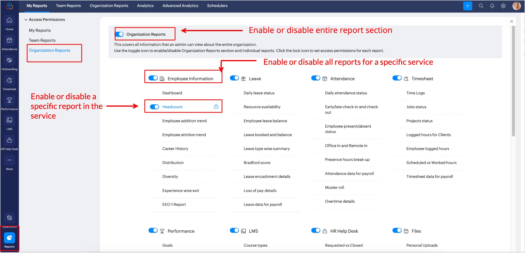 - Organization Reports - Use the toggle button to enable or disable access to the entire report section, specific service reports, or individual reports within the service.