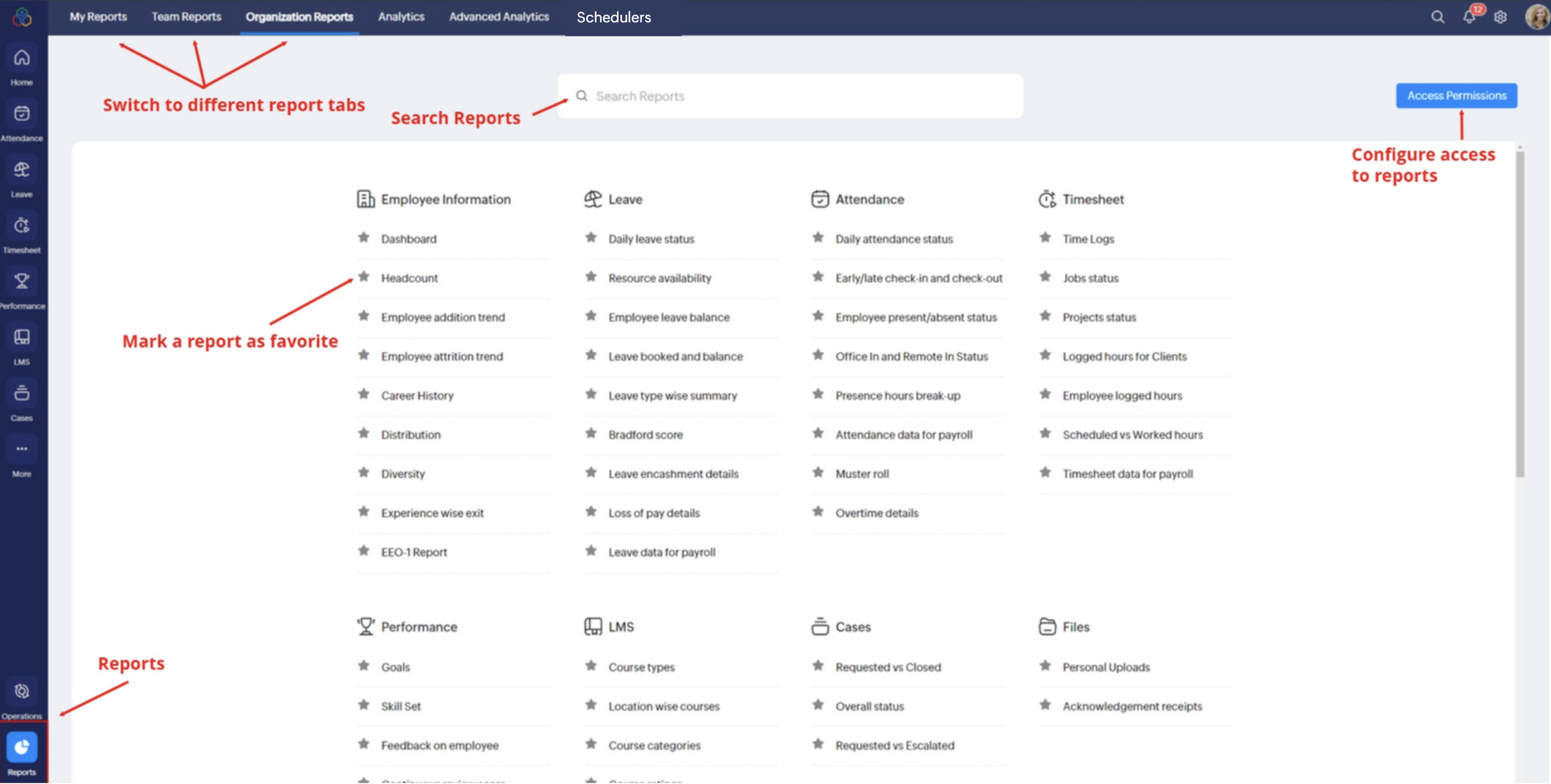 Reports is a consolidated space for all reports from the various services in Zoho People. Reports are useful for providing actionable insights and giving a bird's-eye view of what is going on in your organization. Reports are useful for everyone, including administrators, HR, and managers!