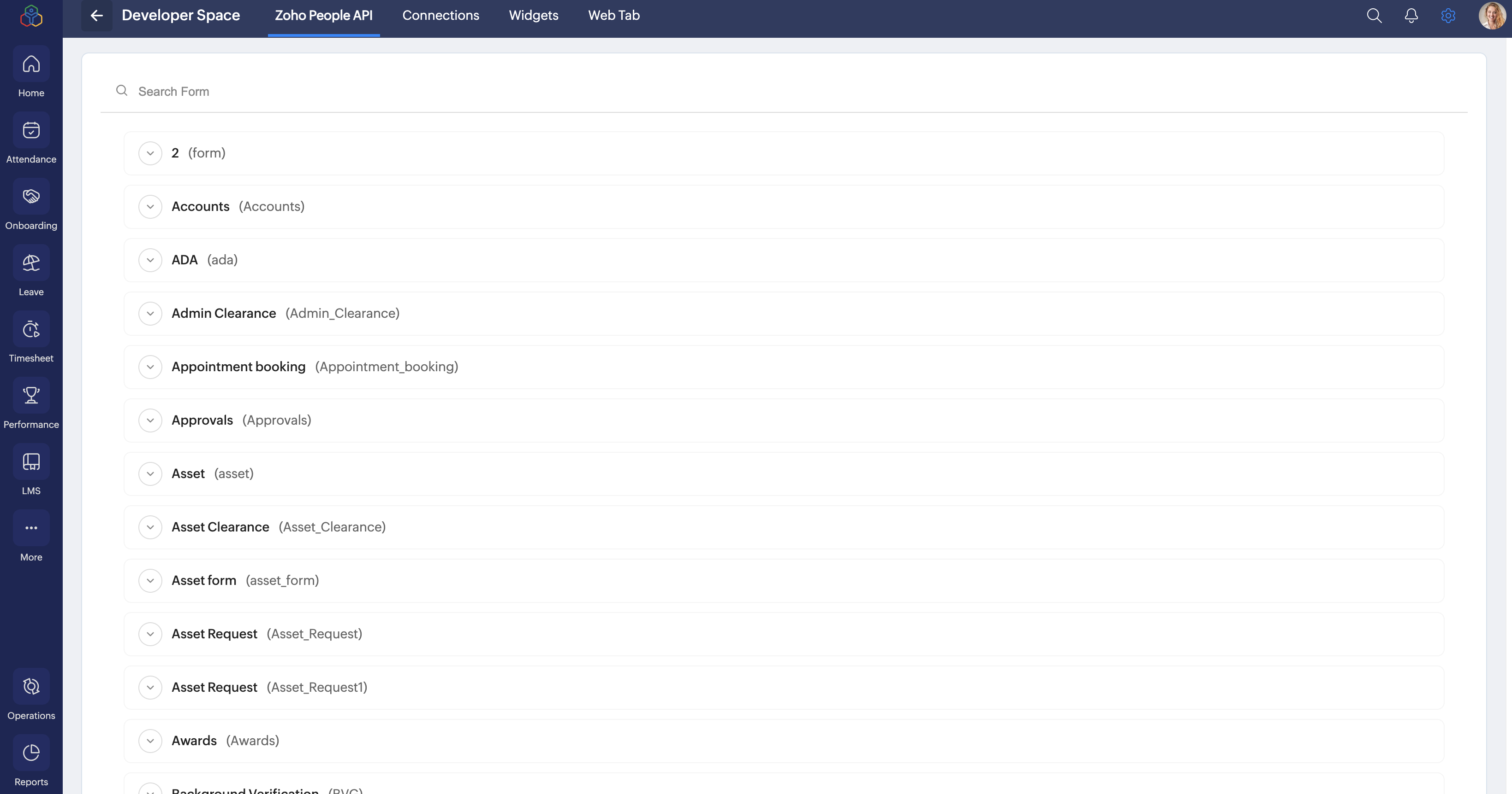 In Zoho People, Developer Space is a feature that allows developers to further extend the capabilities of the Zoho People HR platform. Access Zoho People configuration and data using secure APIs. Using the Developer Space, administrators can create and manage custom third-party connections, create web tabs and widgets.