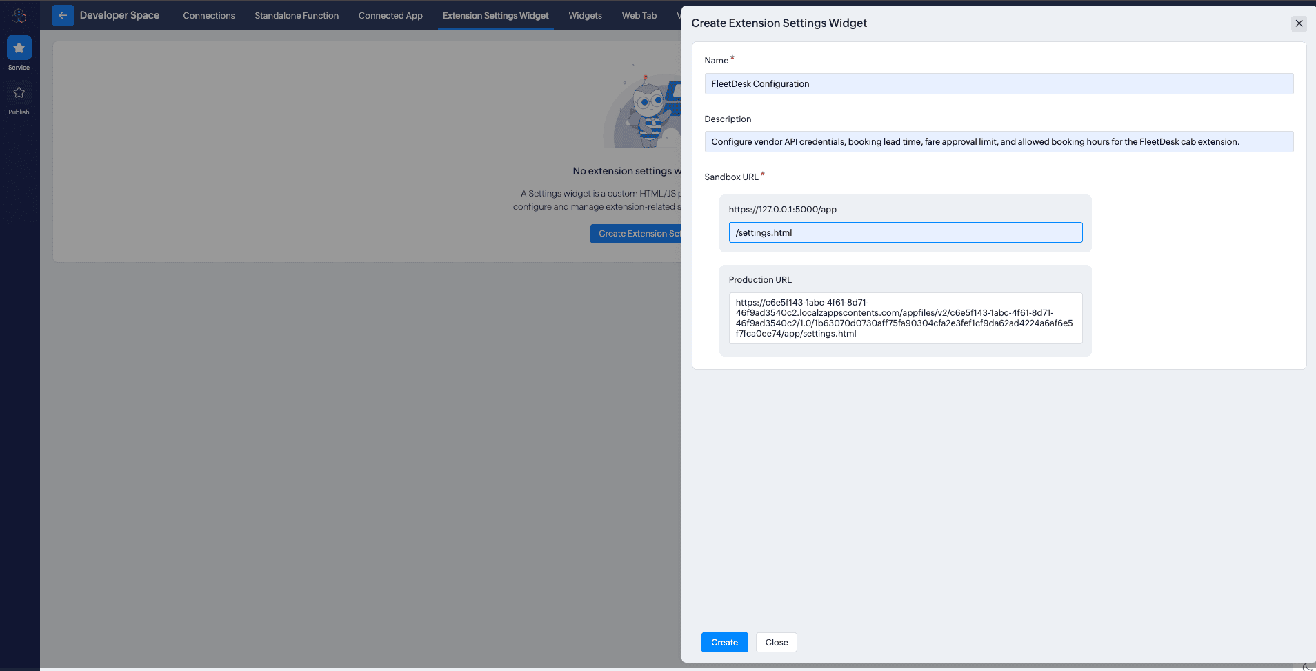 - In your extension application, navigate to Developer Space, Extension Settings Widget.