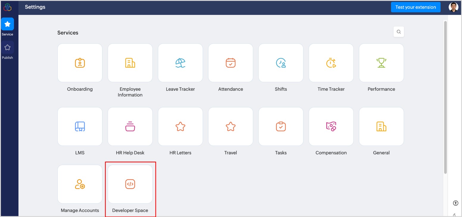 - Upon installing the extension in Zoho People marketplace, admins can access the widget within the Extensions app.