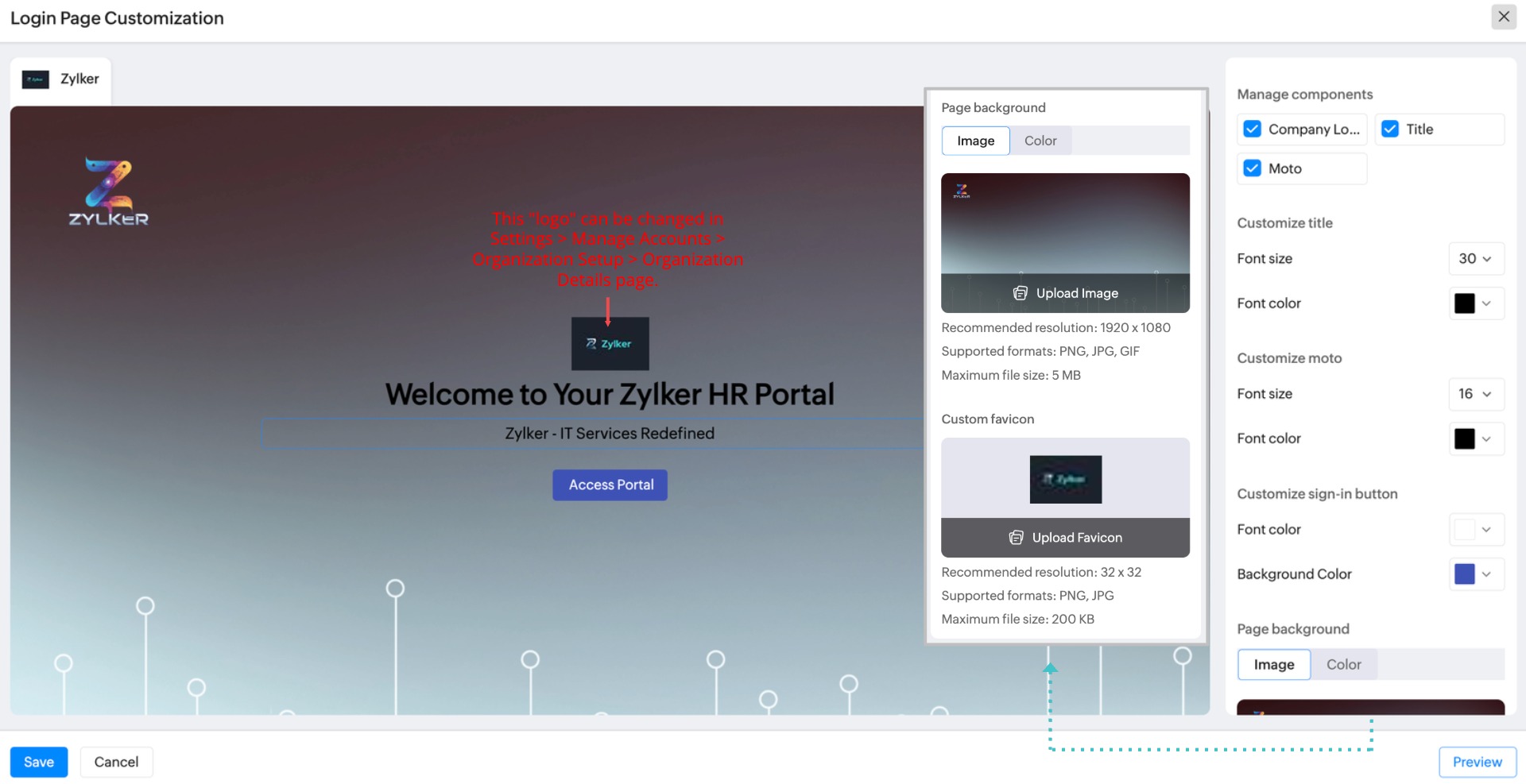 Zoho People features a login page customization option. However, to use this feature, ensure that a rebranded login URL is setup first using the steps above (a verified domain will be required). Follow the steps below to customize the login page: