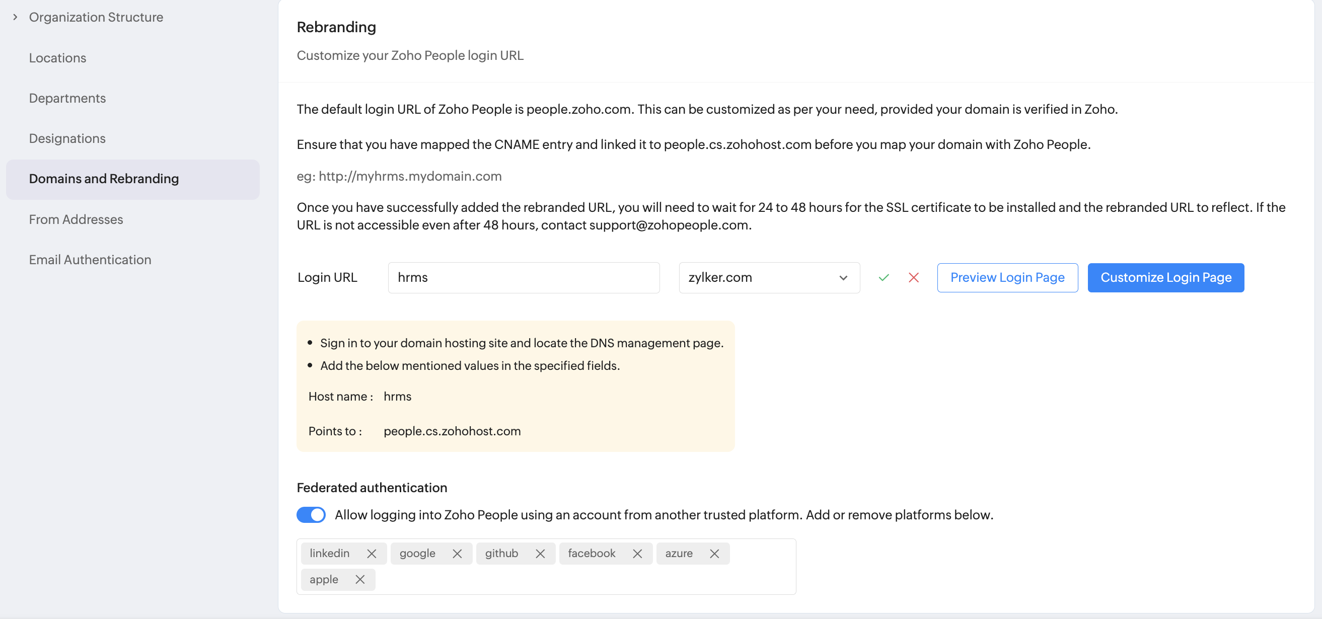Share the rebranded URL (eg: hrms.zylker.com) to your employees to let them access the rebrand page to access Zoho People. If you wish to customize the login page or enable federated authentication, read the topics covered below.