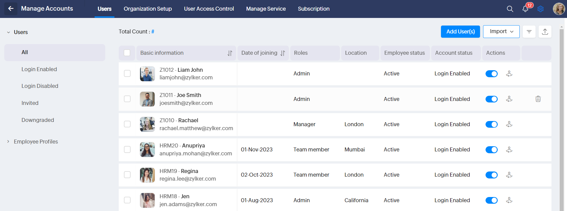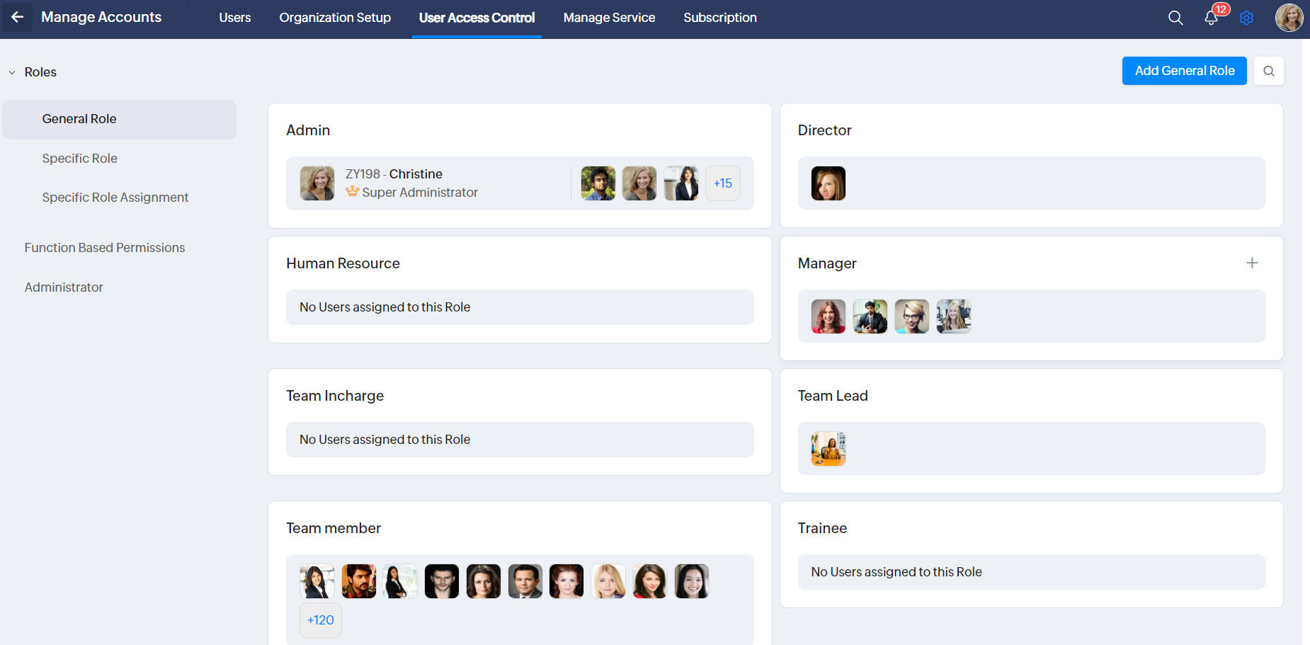 User Access Control - Define and manage user permissions associated with the various roles (tires of users in Zoho People), ensuring secure and role-based access to specific modules, data, and features within the platform. Learn more about User Access Control.