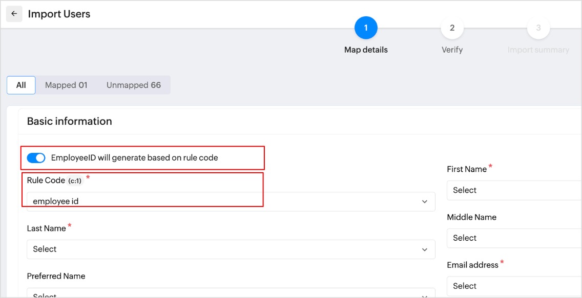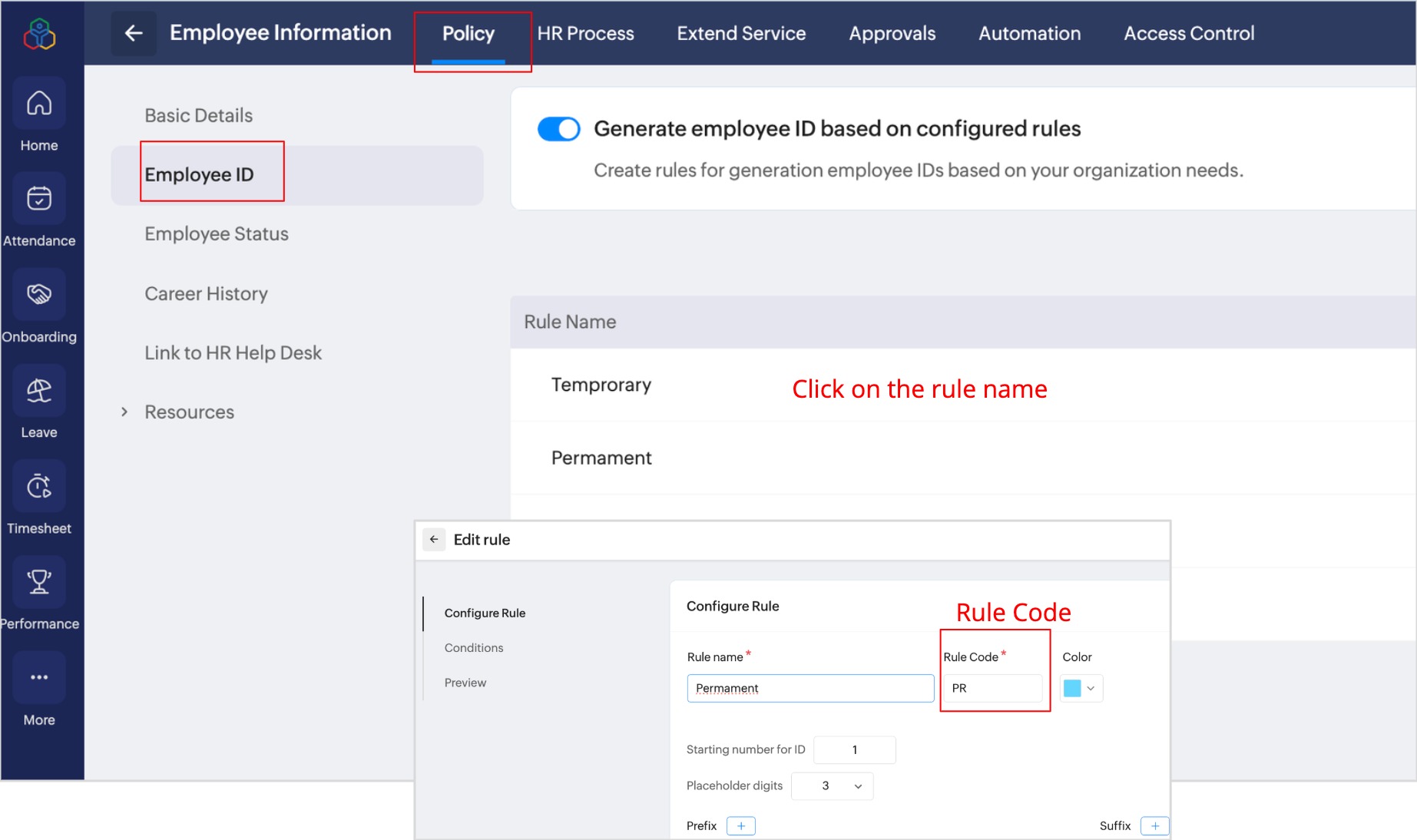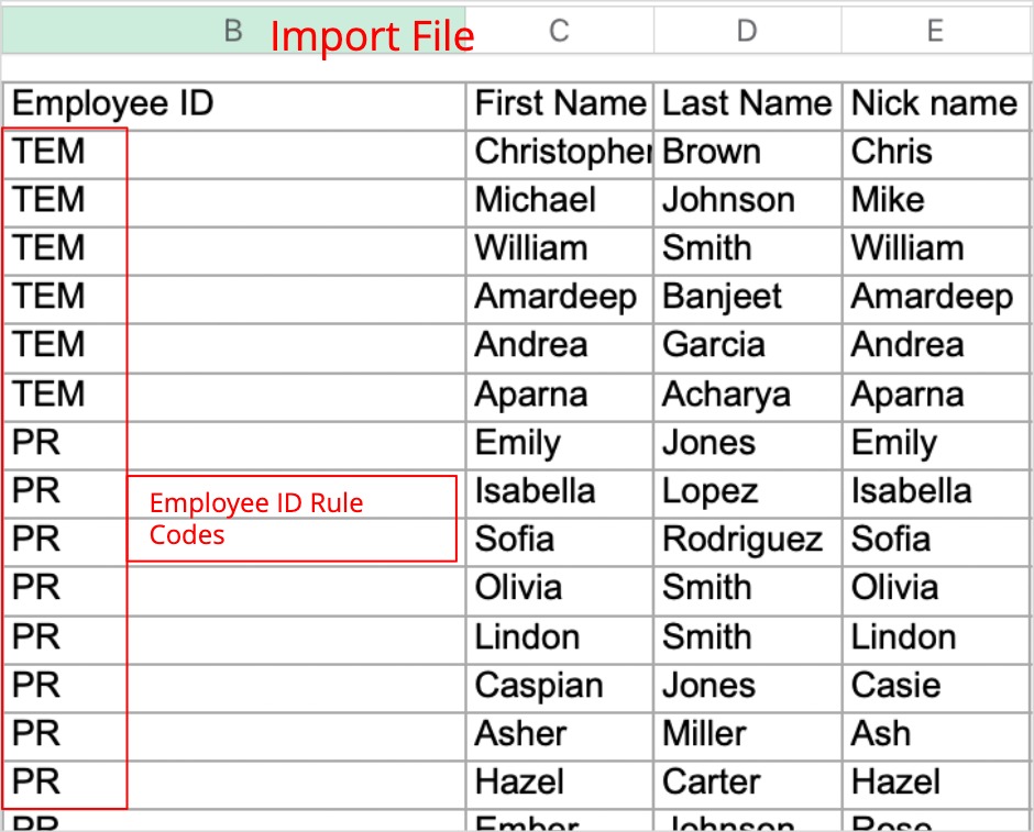 To automatically generate Employee IDs during import, you must first configure Employee ID generation rules. Follow these steps: