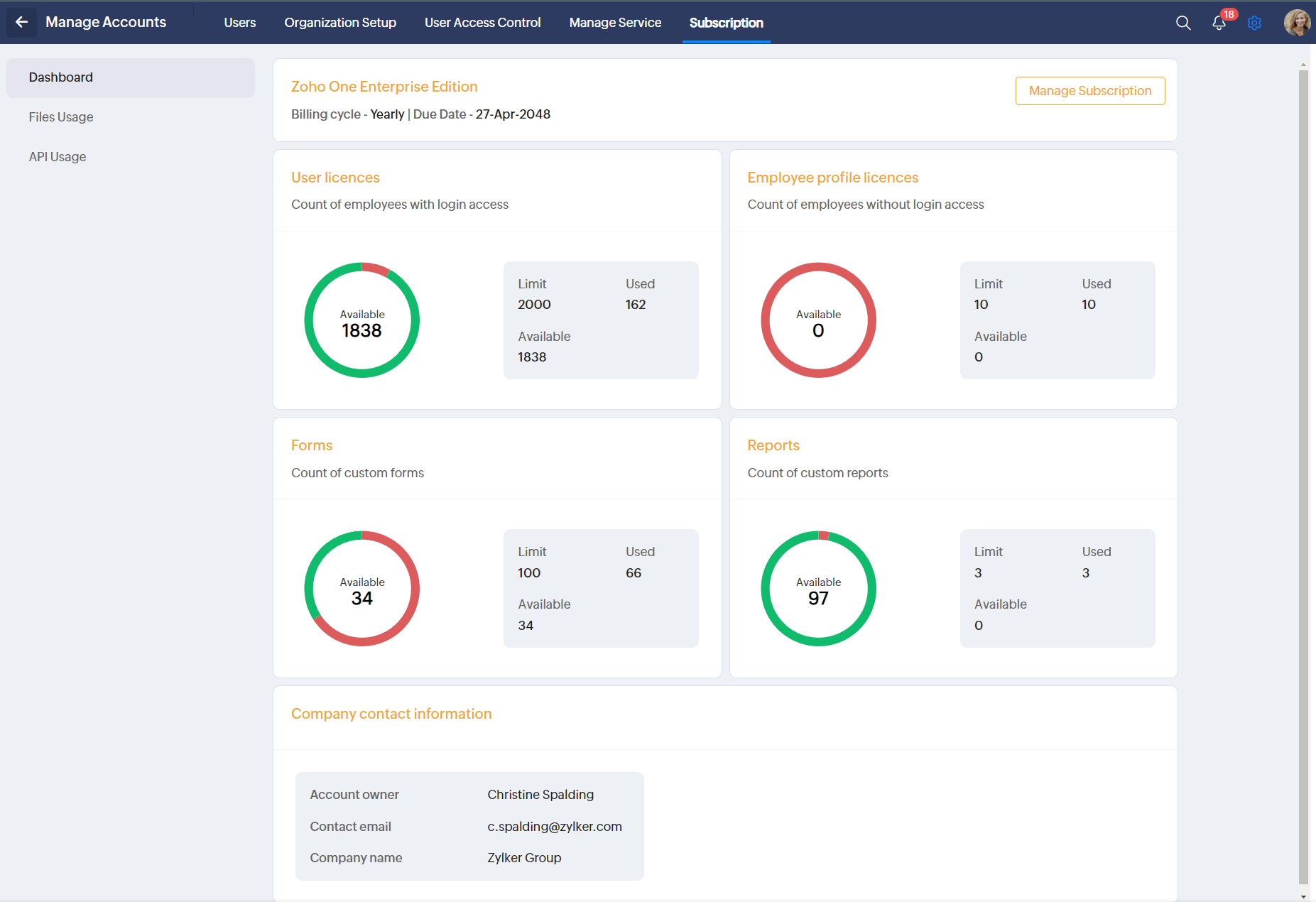 View details about your subscription and license counts. This page includes a link to manage your paid subscription. Also view your storage and API usage status. Learn more about Zoho People pricing and subscriptions. You can also close your Zoho People organization here. Click here to learn more about organization closure.