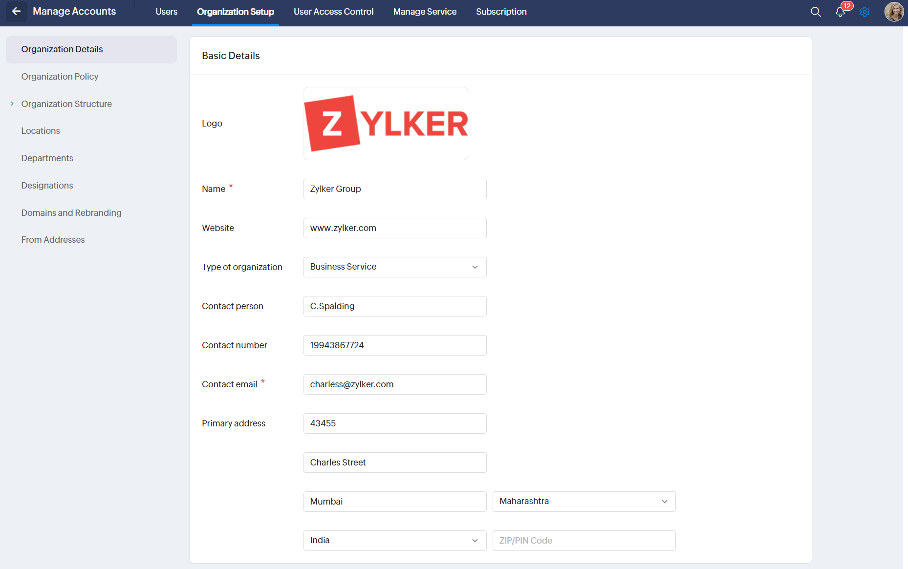 Organization Details - This includes the basic details about your organization, such as the name, website, type, etc.