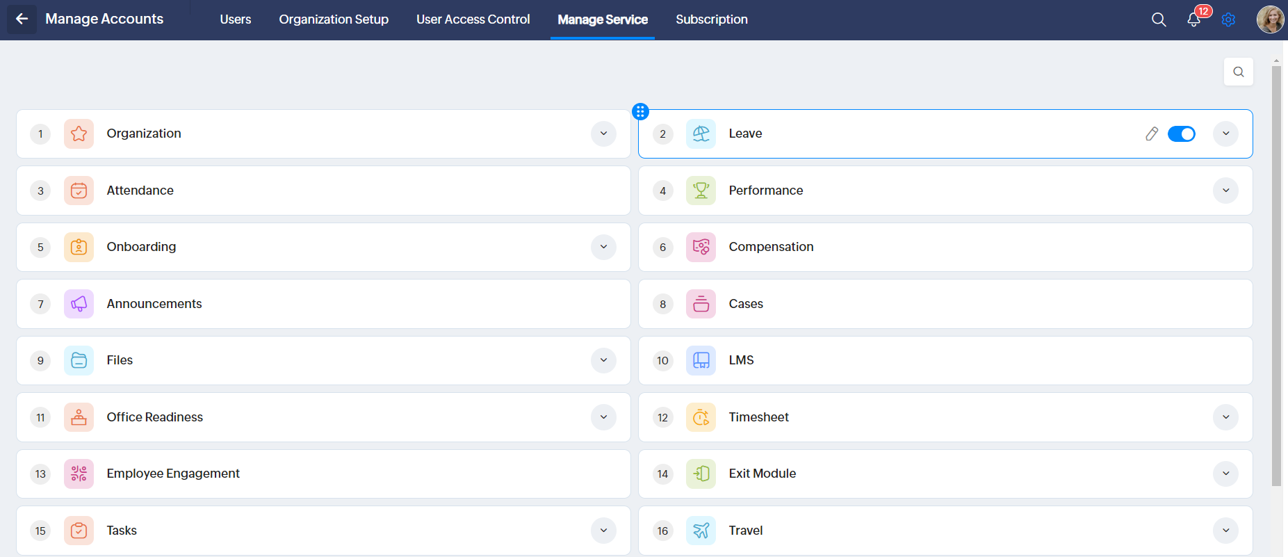 To setup Zoho People, go to Settings (top-left corner gear icon) > Manage Accounts page.
