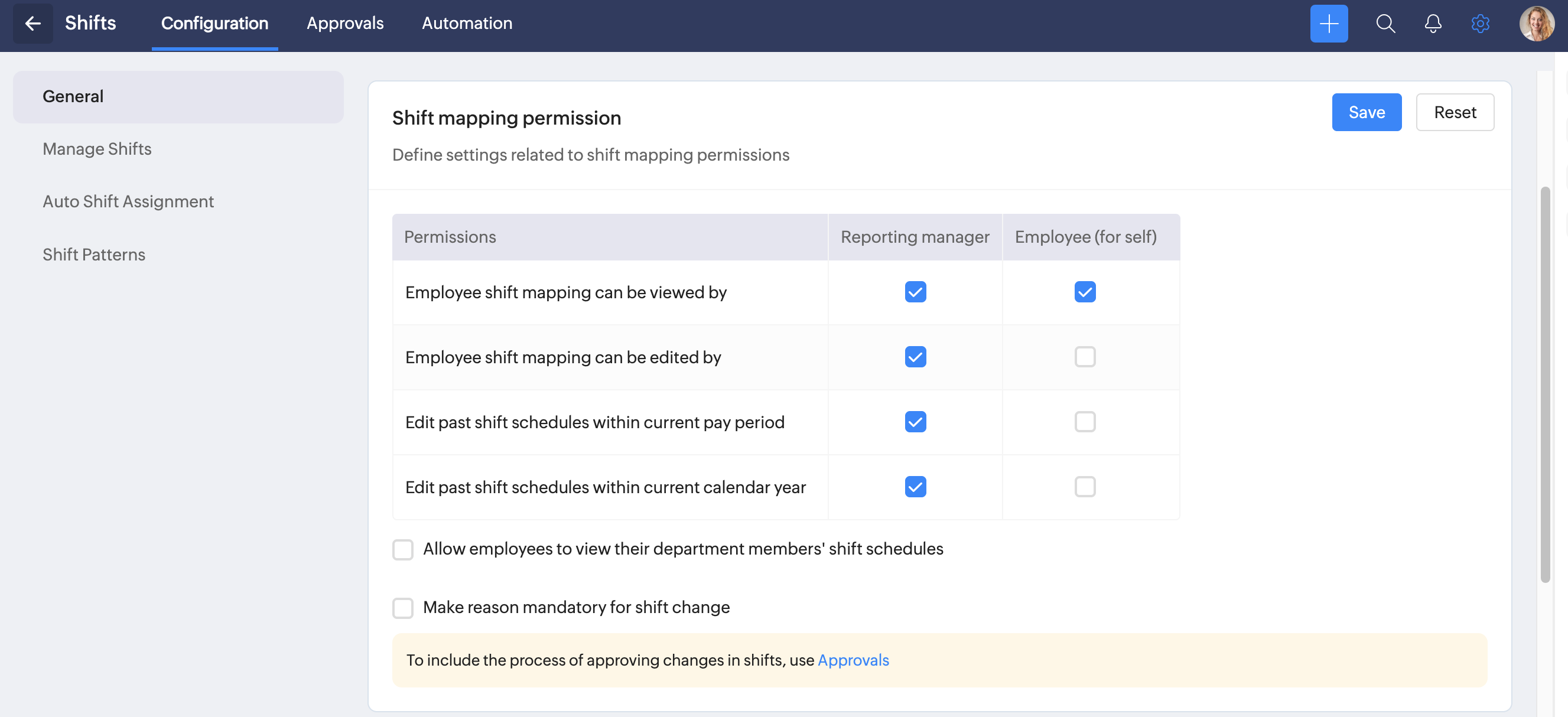 Looking to configure the attendance policy in your organization? Click hereConfigure permissions for the Shift Mapping in Zoho People in this section. Users with the Reporting Manager role can be granted permission to configure and edit shift mapping, which can be modified as needed. Additionally, Employees can be given the ability to view and edit shift mapping details.