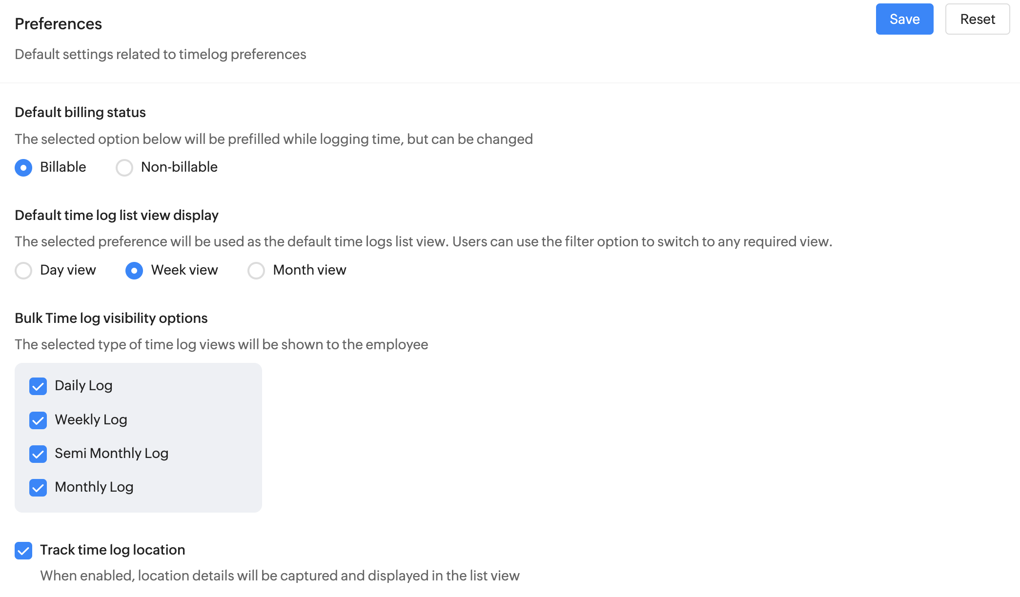 Track time log location: If you want to ensure that your employees are logging time from certain permitted locations, this option will capture their location details and display them in the list view.