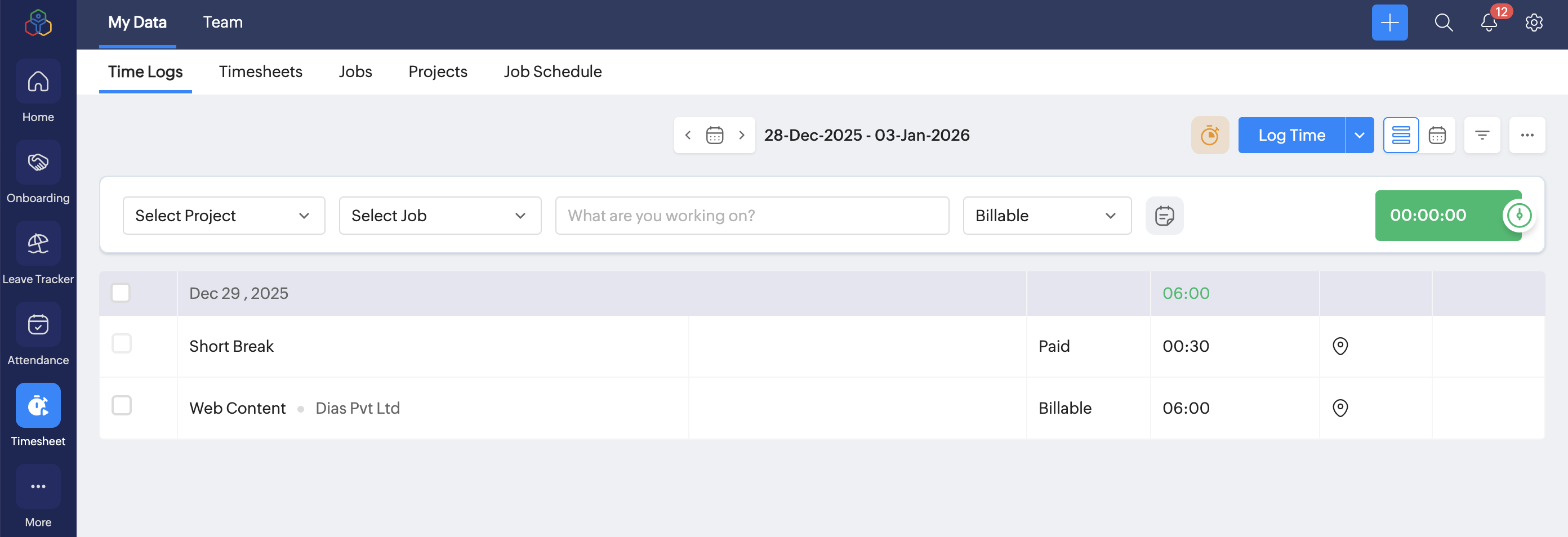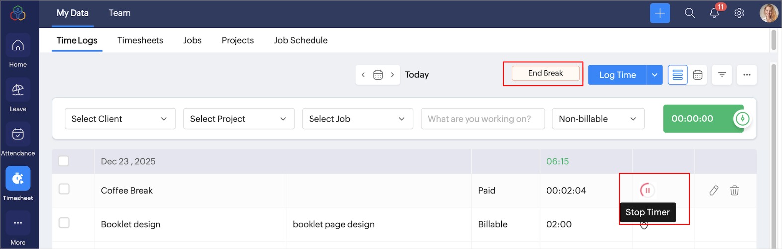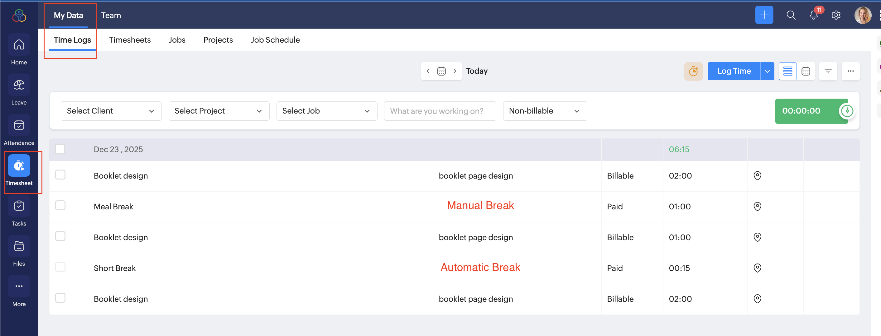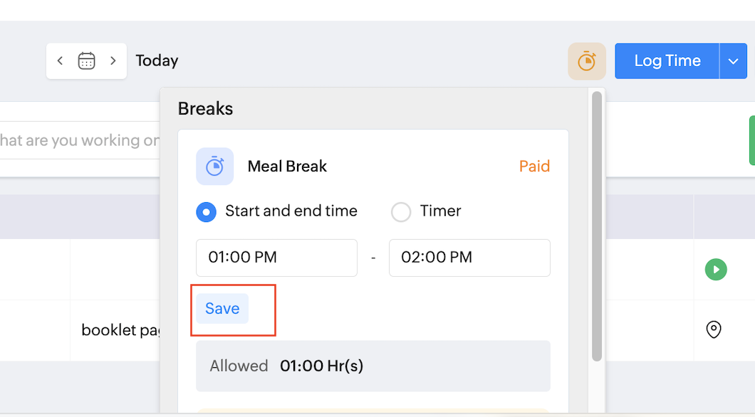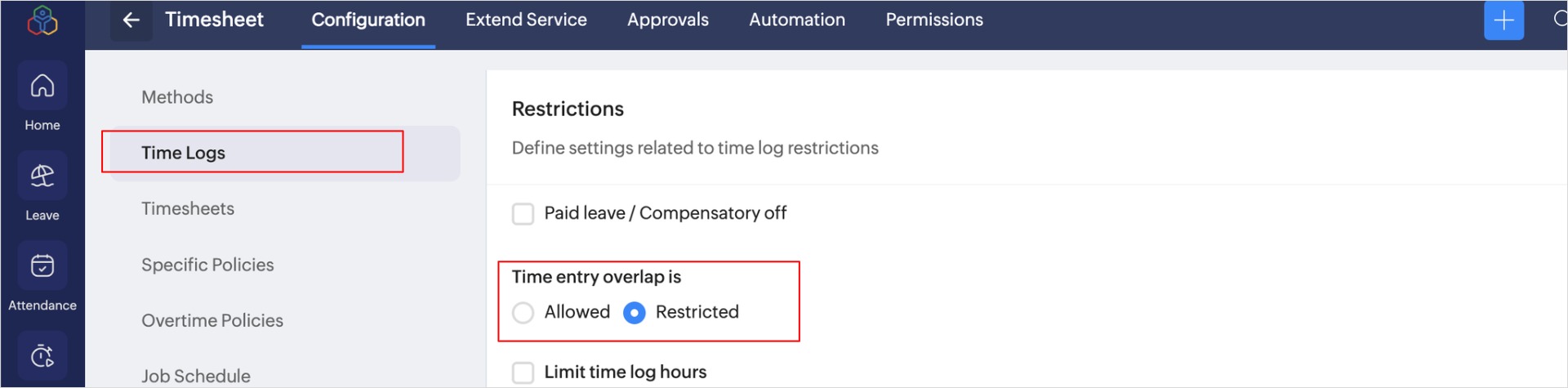 When Time entry overlap is set to Restricted, time logs cannot overlap with breaks. If an automatic break occurs during a time log, the system automatically splits the time log. The overlapping time is recorded as a break, and the remaining time is saved as separate time logs.