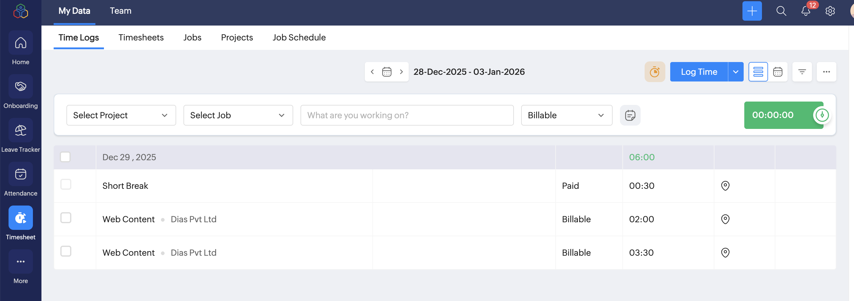 When time entry overlap is allowed, breaks can overlap with time logs without splitting them. The time log remains unchanged at 6:00 hours, and the break is logged separately as 00:30. This is useful when breaks are tracked for visibility or compliance without affecting recorded work duration.