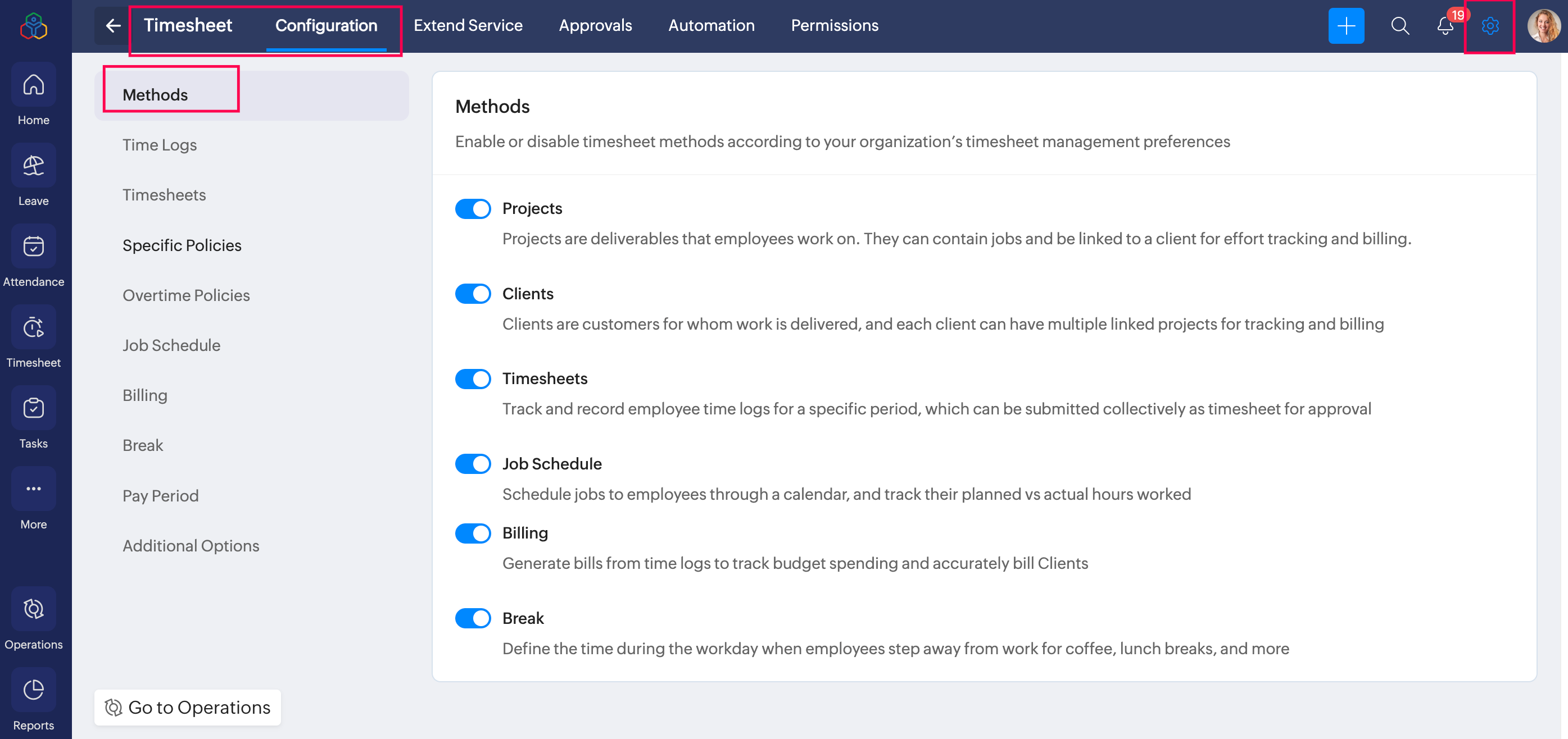 To enable or disable timesheet methods:
