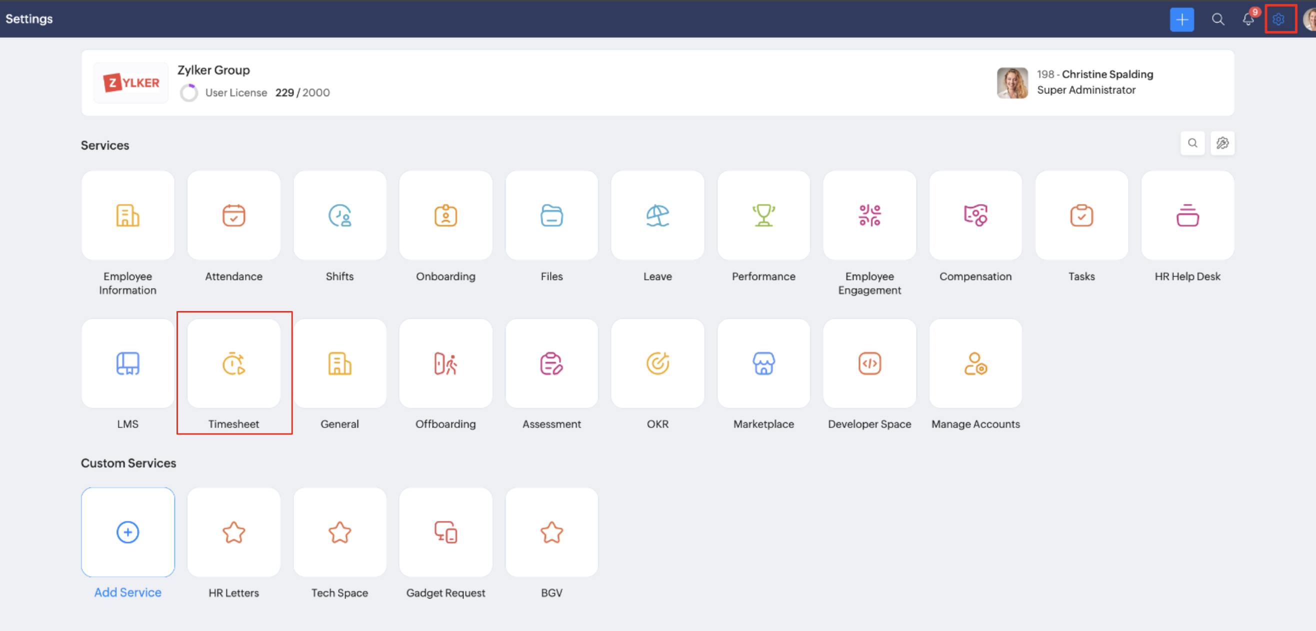 To access Timesheet service settings, go to Settings (gear icon on the top-right corner) > View All > Timesheet (Visible only to Super Administrator and roles with administrative access).