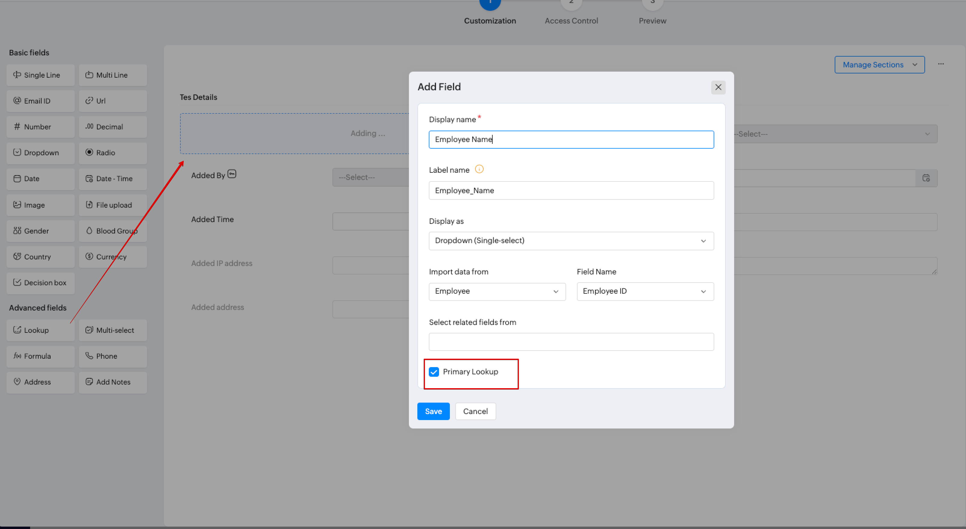 When a form is created, the system automatically assigns the "Added by" field as the primary lookup. However, you cannot assign Add permissions to this field.