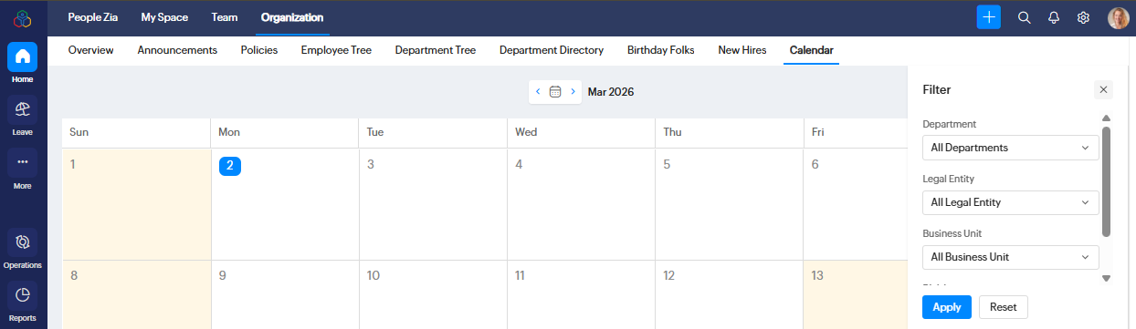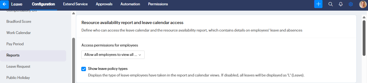 If you want to allow employees to view other users' leave in Zoho People, from the admin account go to Settings (Gear Icon) > View All > Leave Tracker > Configuration > Reports, then configure the settings below and click Submit.