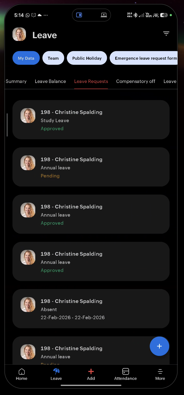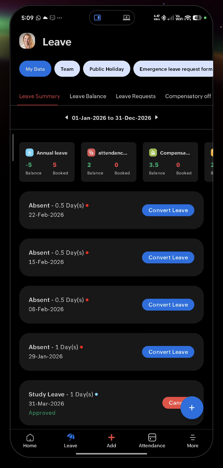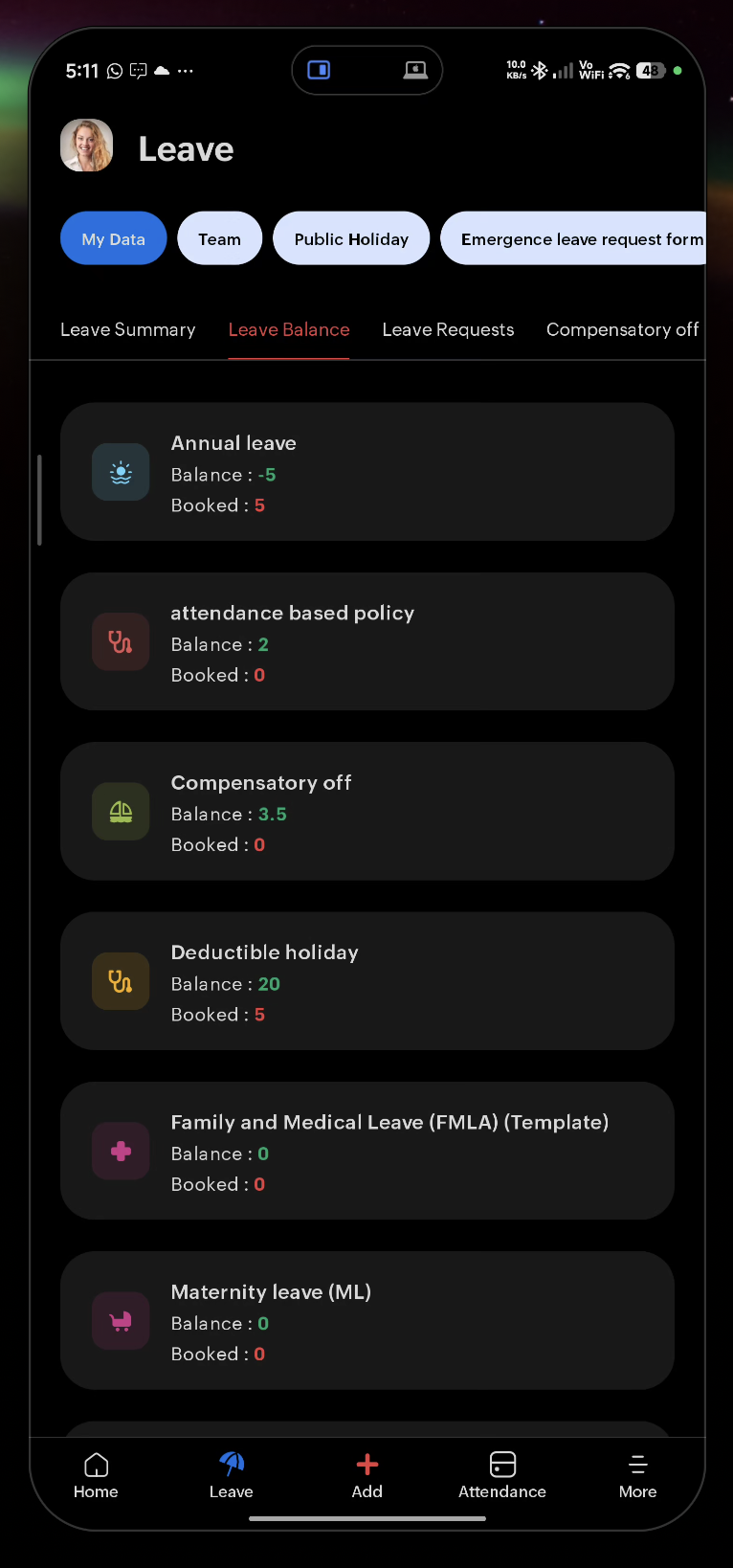 - Leave — Your leave requests and balance
