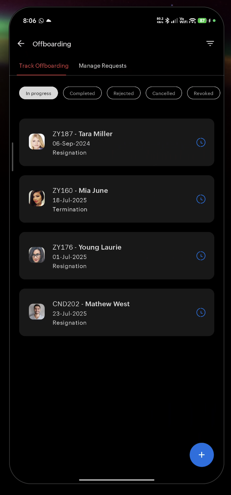 Track offboarding requests by status. i.e, In Progress, Completed, Rejected, Cancelled, Revoked. You can select an individual request to view more details.