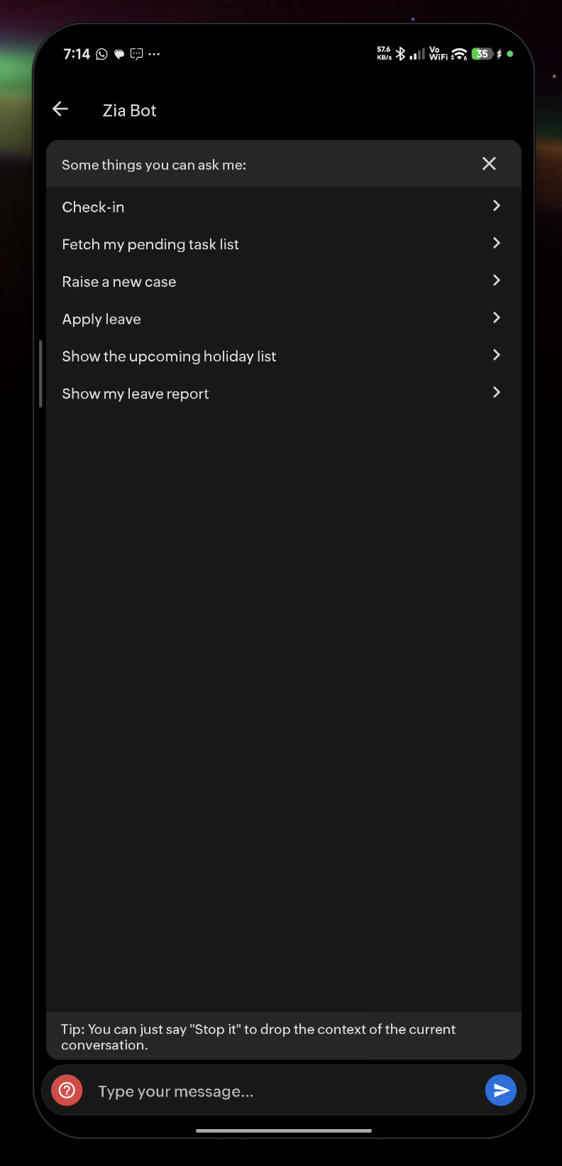 Zia's ability to answer questions depends on your organization's data and the features enabled in your Zoho People account.