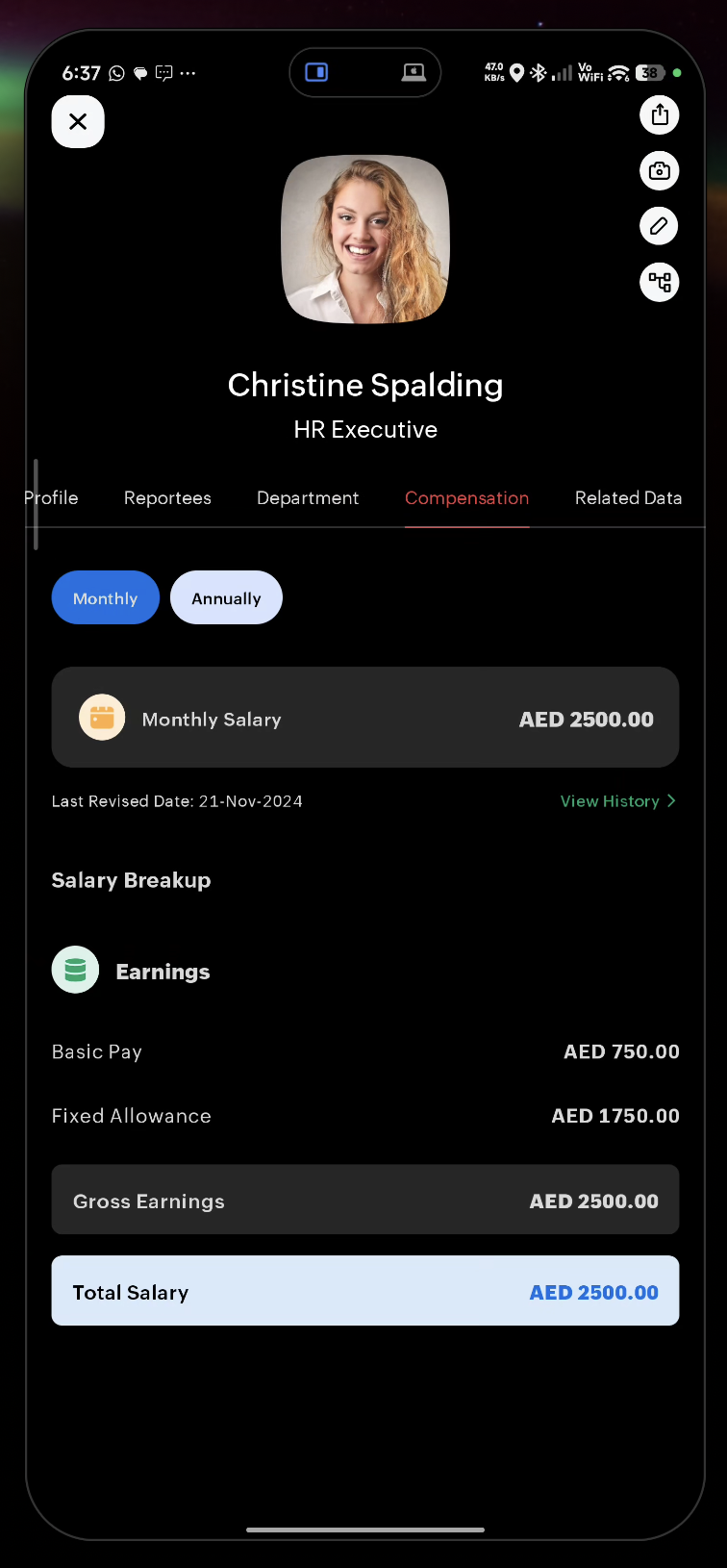 - Department — View department head, sub-departments, and associated employees