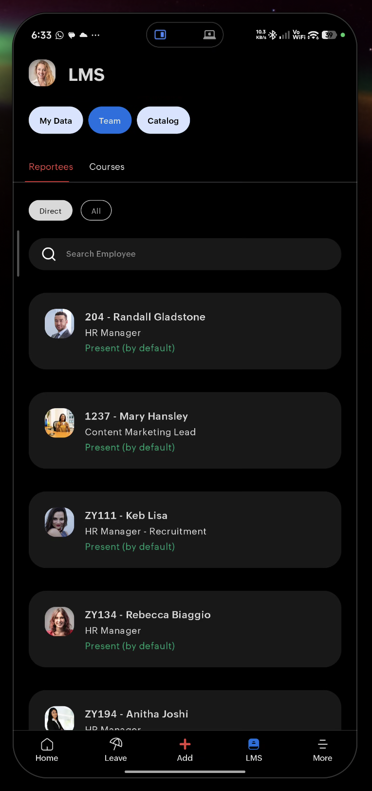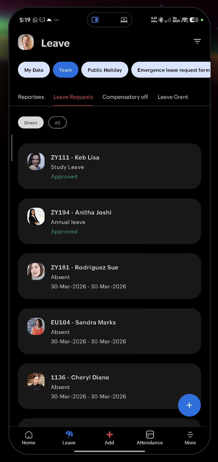 - Reportees — Your direct reports with attendance and leave status. Includes search and all-reportees filter
