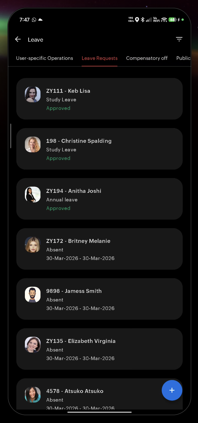 "Operations" in Zoho People Mobile App