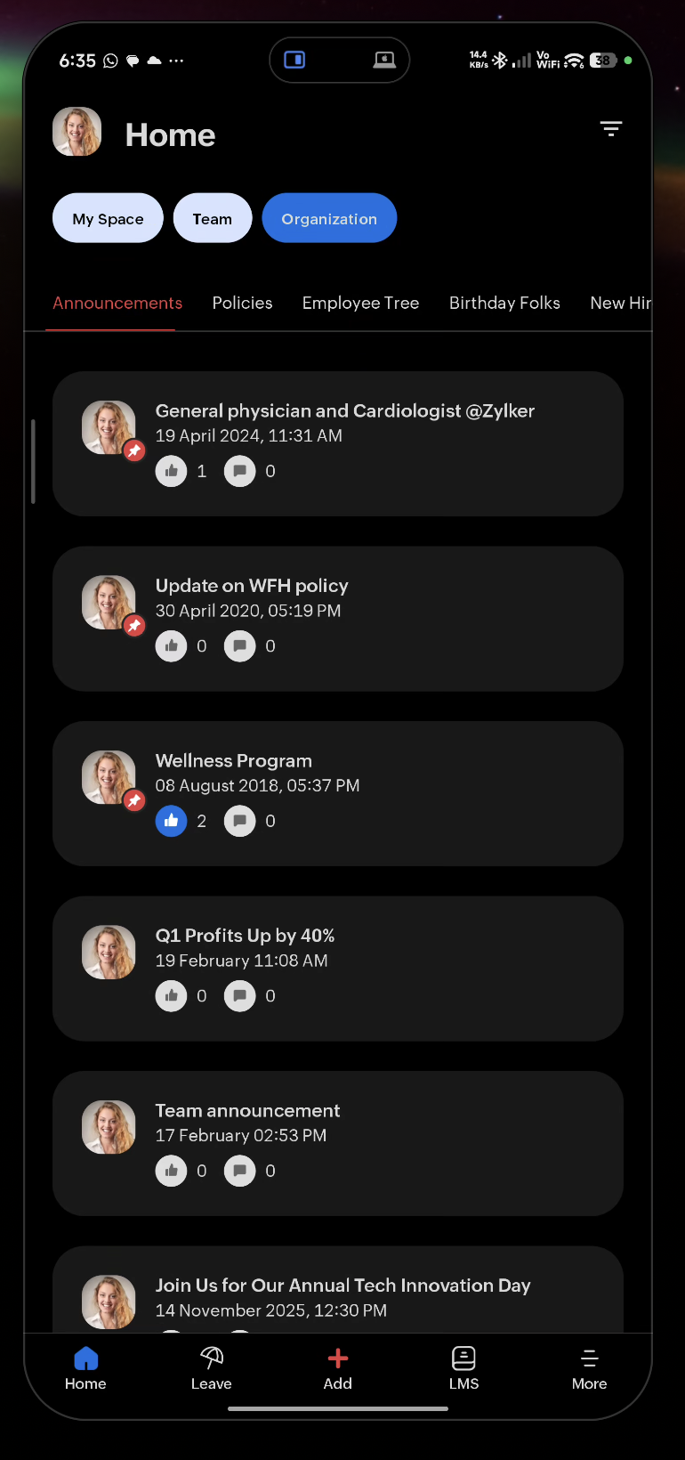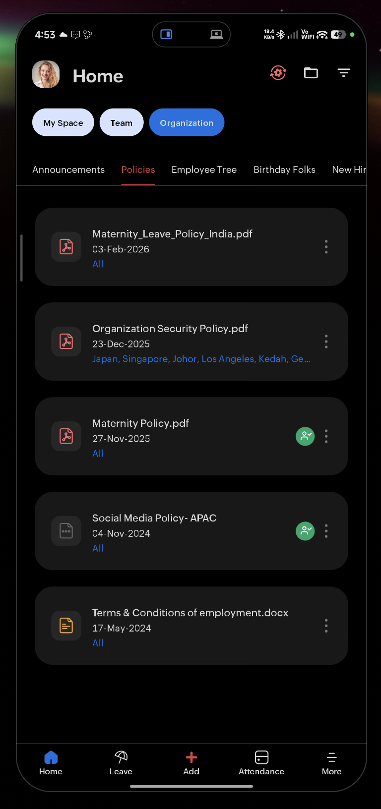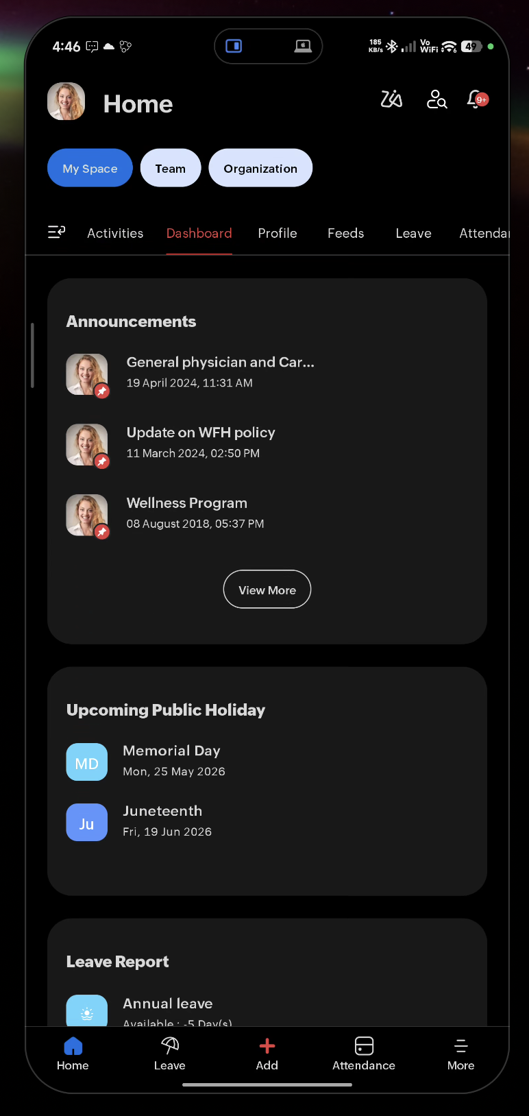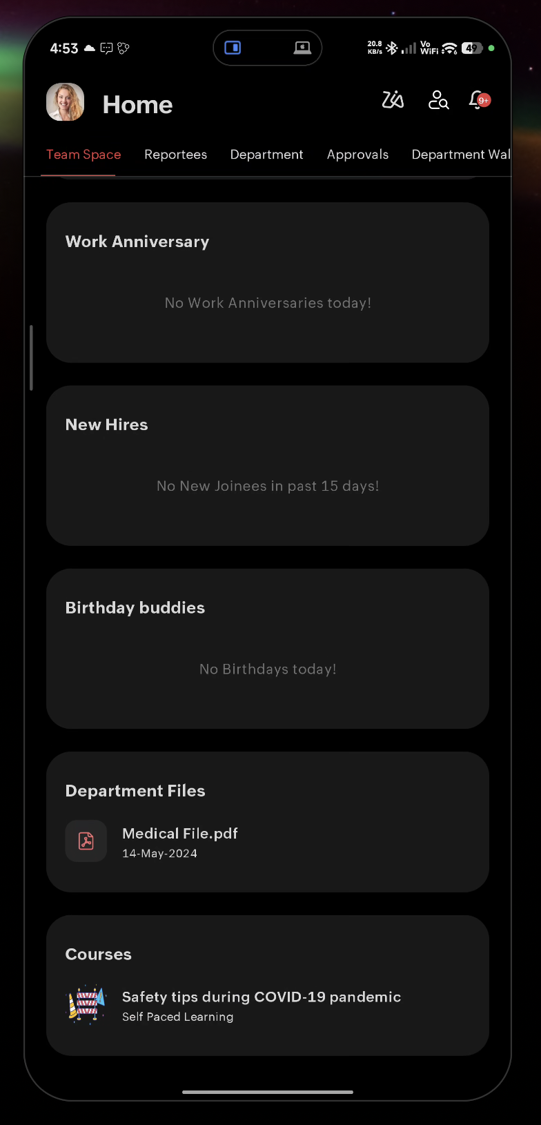 - Team Space — Team details including team email ID, strength, work anniversaries, new hires, birthday buddies, and department files