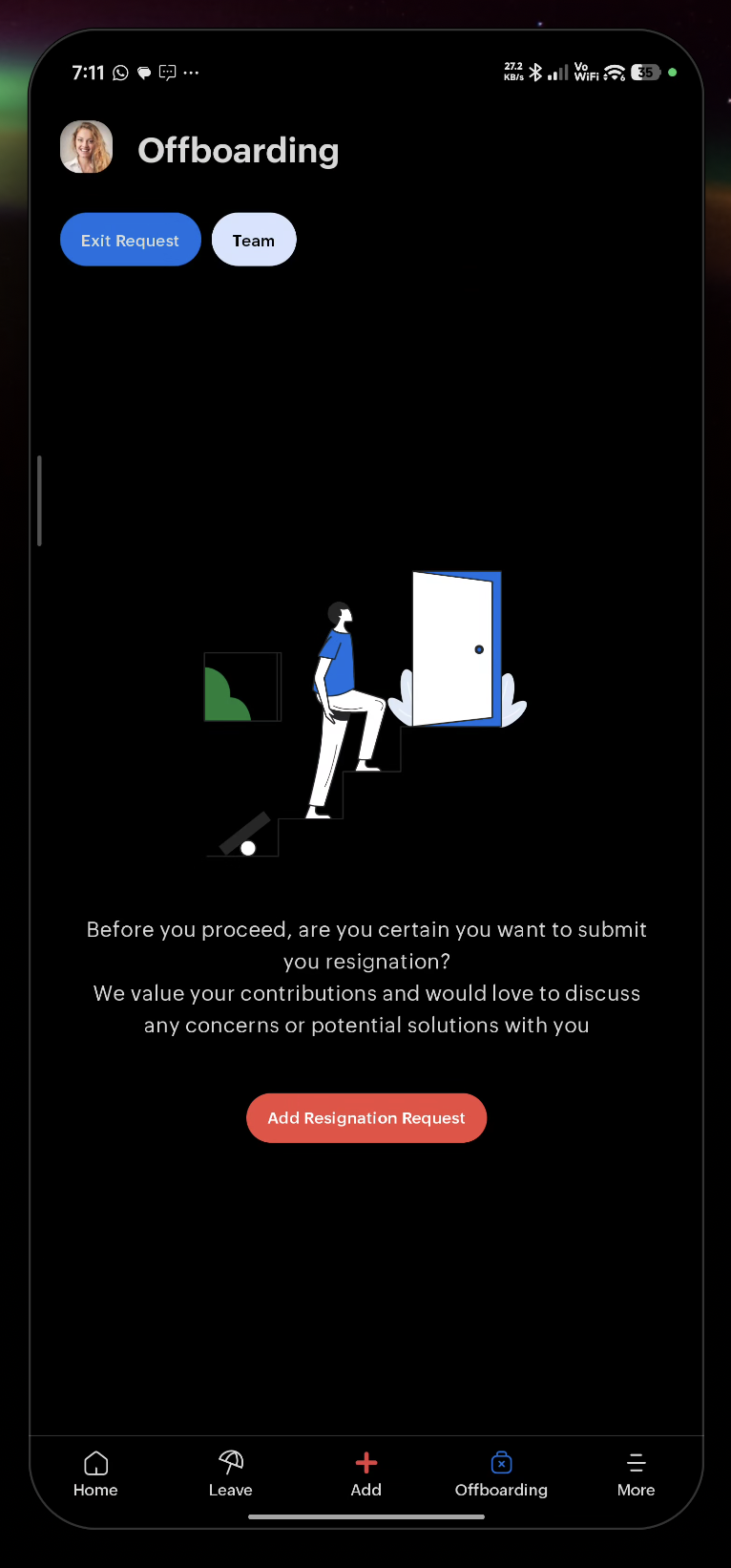 Navigate to Home > More > Offboarding service, tap Add Resignation Request: